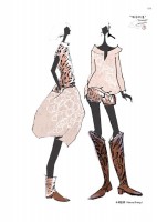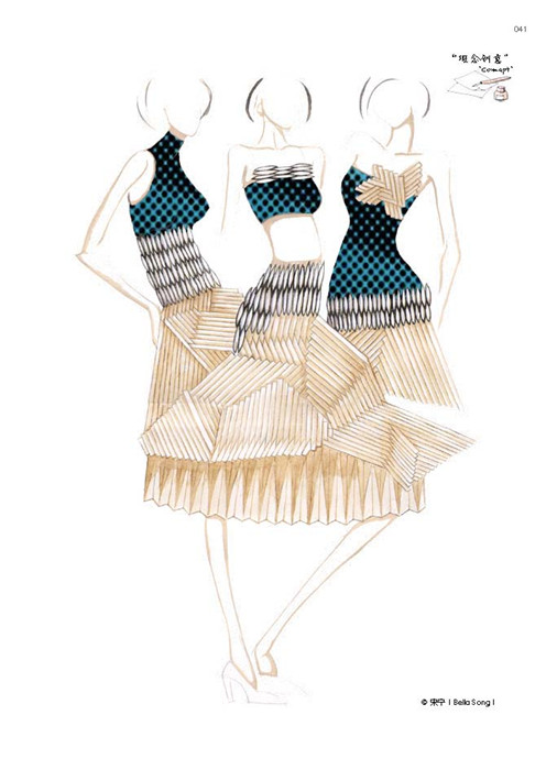 中英文對(duì)照,手繪和實(shí)景照片穿插。此外,每個(gè)案例用一張時(shí)裝效果圖解讀建筑的創(chuàng)意,稱為“靈感來源”;用材料細(xì)節(jié)圖剖析建筑立面的材料,就像分析服裝的面料,稱為建筑的“面料定制”;如何將立面材料圍合運(yùn)用到建筑體上面,就像面料如何剪裁縫合才能變成衣服,此部分被稱為“剪裁制版”;最后,來一個(gè)建筑的全景亮相,稱為“成衣展示”,這樣一來,一個(gè)項(xiàng)目的“時(shí)裝”的從無到有的整個(gè)經(jīng)過,就被介紹的一覽無余了。