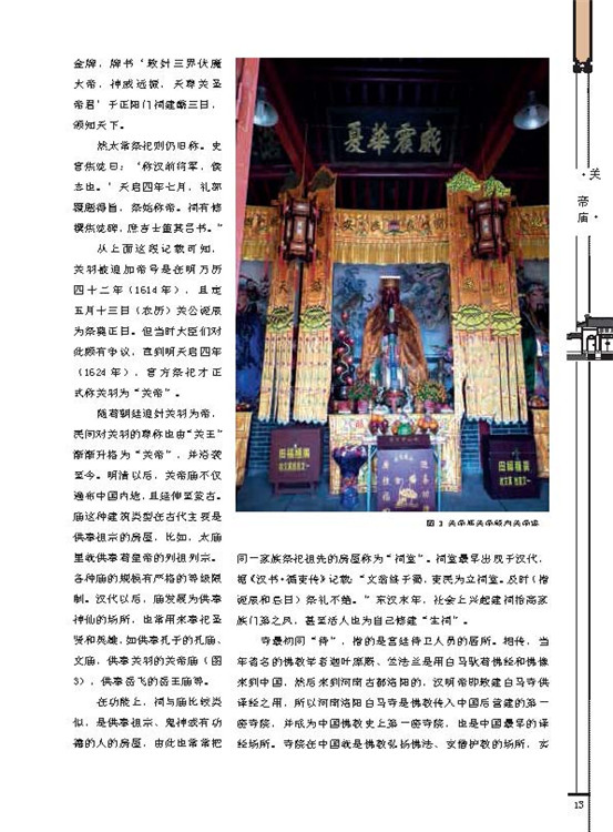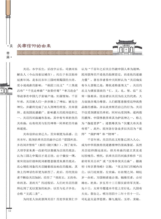 關(guān)羽,本字長生,后改字云長,司隸河?xùn)|解良人(今山西省運(yùn)城市),約生于東漢桓帝延熹年間,是東漢末年三國時(shí)期蜀國的大將。受小說戲曲的影響,“桃園三結(jié)義”“三英戰(zhàn)呂布”“千里走單騎”“刮骨療毒”“單刀赴會”等故事在中國幾乎家喻戶曉,婦孺皆知。千百年來,關(guān)羽被人們一步步捧上了神壇,被完全神化,并最終完成了由人到神的轉(zhuǎn)變。關(guān)帝崇拜 , 是我國流播最廣、影響最大的民間信仰之一。關(guān)羽的祠廟遍布各地,其中有專奉祀他的關(guān)帝廟,也有將其與別的神佛一同奉祀的寺廟和道觀。