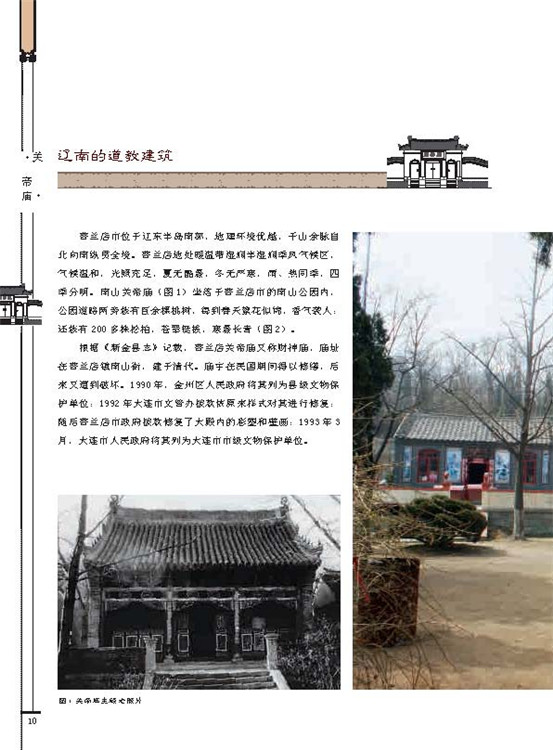 普蘭店市位于遼東半島南部,地理環(huán)境優(yōu)越,千山余脈自北向南縱貫全境。普蘭店地處暖溫帶濕潤半濕潤季風(fēng)氣候區(qū),氣候溫和,光照充足,夏無酷暑,冬無嚴(yán)寒,雨、熱同季,四季分明。南山關(guān)帝廟坐落于普蘭店市的南山公園內(nèi),公園道路兩旁栽有百余棵桃樹,每到春天繁花似錦,香氣襲人;還栽有 200 多株松柏,蒼翠挺拔,寒暑長青。