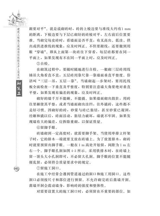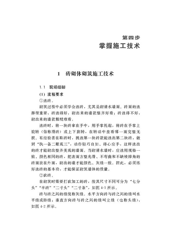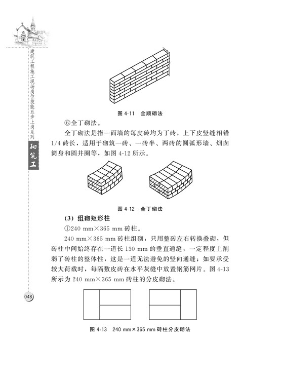 本書以住房和城鄉(xiāng)建設(shè)部建筑工程施工職業(yè)技能標(biāo)準(zhǔn)為編寫依據(jù),將砌筑工上崗分為五步:第一步———確保上崗資格;第二步———遵守行業(yè)規(guī)范;第三步———熟悉材料工具;第四步———掌握施工技術(shù);第五步———保障施工安全。