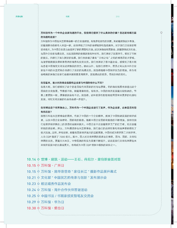 全書以時(shí)間為主線,依照場館的籌備、規(guī)劃、設(shè)計(jì)、建造、運(yùn)營以及后世博遺產(chǎn)的文件保護(hù)計(jì)劃這一進(jìn)程分為6個(gè)部分。共有十余位主創(chuàng)人員記錄了每一個(gè)階段的心路歷程:靈感碰撞、矛盾激發(fā)、方案升級、圓滿落成,以至于情緒的波動也都有細(xì)微呈現(xiàn)。使讀者能夠身臨其境地參與到一個(gè)巨大項(xiàng)目從籌備到落實(shí)的跌宕起伏。每一部分的檔案環(huán)節(jié)還摘有具體的規(guī)劃圖、設(shè)計(jì)圖、施工圖、流程圖等,更能深度解密萬科館這條“中國龍”的前世今生。萬科館是中外企業(yè)界乃至城市間密切交流的橋梁與紐帶,促進(jìn)了中意兩國文化、經(jīng)濟(jì)和商業(yè)等各領(lǐng)域的交流,向世界展示了當(dāng)代中國的精神風(fēng)貌和當(dāng)代中國人的生活面貌。后世博遺產(chǎn)的“龍?計(jì)劃”也為文物保護(hù)工作開拓了新的思路。