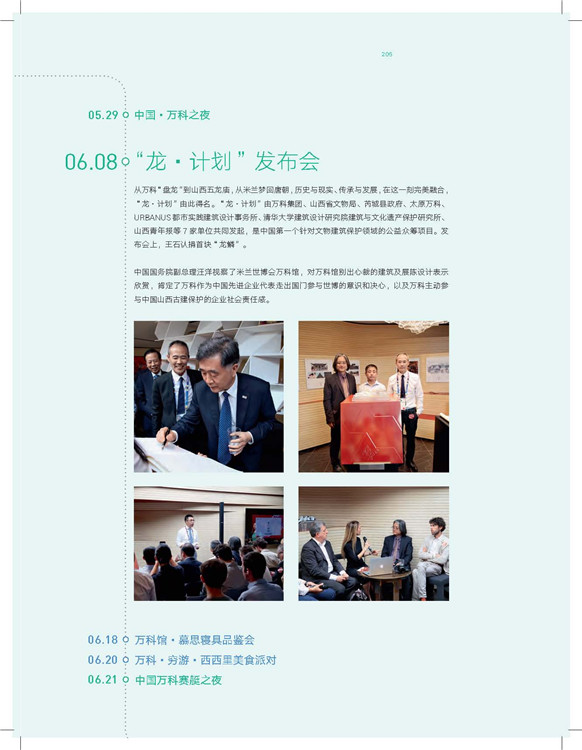 本書記錄了完整呈現(xiàn)米蘭萬科館從想法到實(shí)現(xiàn)的全流程,從前期策劃、設(shè)計(jì)、建造、運(yùn)營和后世博遺產(chǎn)計(jì)劃幾大階段,向讀者展示184天臺前精彩亮相背后的布局籌措。萬科館帶給觀眾帶來一種文化覺醒的意味。冥冥之中,隱藏于眾多不同面向的參與者的意念里,有一條一以貫之的關(guān)于傳統(tǒng)與未來的暗線:建筑師里伯斯金從一種超現(xiàn)實(shí)的設(shè)計(jì)手法出發(fā)卻無意間回歸到千年而來的中國農(nóng)耕文化圖騰——龍;展陳設(shè)計(jì)方RAA將傳統(tǒng)竹料與腳手架并置,隱喻了未來與傳統(tǒng)的沖突與統(tǒng)一;平面設(shè)計(jì)的簡體漢字,構(gòu)建了一種易于溝通的東方語言;“龍?計(jì)劃”里盤旋了千年而重新蘇醒的傳統(tǒng)村廟文化。