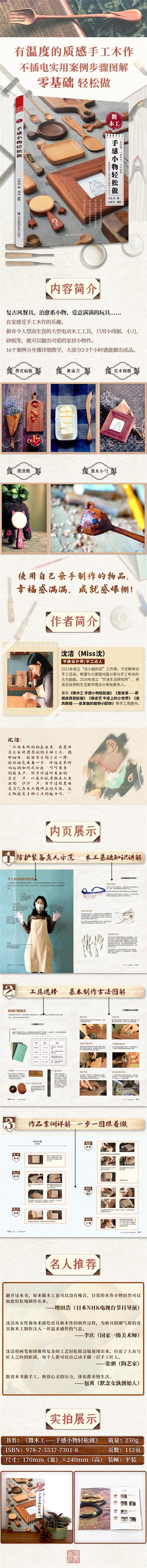 打破人們對木作繁重的單一理解,手工達人沈潔依舊延續(xù),以制造生活美學為初衷的創(chuàng)作理念,只用簡單的線鋸、小刀、砂紙做出非常有趣的家具小物件。讓手作走進人們的生活。從生活的點滴制作中,感受木作手工的樂趣,書中的案例都是日常生活中使用率很高的物品,簡約而實用,花一下午的時間,自己做個收納盒或是一套餐具,在不經(jīng)意中流露出質(zhì)樸自然的生活態(tài)度。大部分2-5個小時就可以做出成品,非常適合木工初學者制作。讓你不出家門即可學會的木作基礎,和家人一起體驗手作的快樂。配以沈小姐超可愛的手繪講解,詳細易懂又更添質(zhì)感。