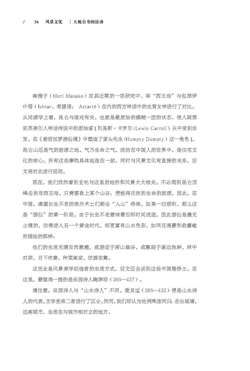 本書所表達(dá)的景觀是一個(gè)文化的、主觀的對(duì)象,并不簡(jiǎn)單等同于某一物理環(huán)境空間,它存在于凝視著它的民眾的視線下。本書內(nèi)容上主要包括六個(gè)部分,分別為歷史的浪潮、大地自身的運(yùn)動(dòng)、三月三、事眛竟誰(shuí)辨、質(zhì)有而趣靈、說(shuō)破之前的隱晦。著者從詞源學(xué)、文學(xué)、藝術(shù)史以及人種學(xué)等多學(xué)科的角度,嘗試闡釋“思索景觀”與“享樂(lè)景觀”這兩個(gè)現(xiàn)象之間的主要矛盾,同時(shí)用比較的方法帶我們?yōu)g覽了眾多大陸的歷史,引發(fā)讀者對(duì)“景觀”概念尤其是文化景觀更深層的思考。
