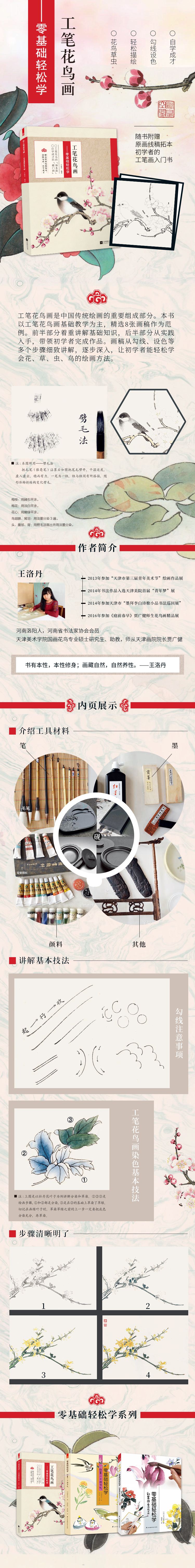 《工筆花鳥(niǎo)畫(huà)——零基礎(chǔ)輕松學(xué)》以工筆花鳥(niǎo)畫(huà)基礎(chǔ)教學(xué)為主,共以8張示范畫(huà)稿為例,依次從簡(jiǎn)單到復(fù)雜,循序漸進(jìn)來(lái)完成作品。每張畫(huà)稿分別從勾線、設(shè)色等多個(gè)步驟細(xì)節(jié)展示,逐步深入刻畫(huà),輔以通俗易懂的分步驟講解說(shuō)明,使讀者能夠輕松學(xué)會(huì)各種花卉、草蟲(chóng)和鳥(niǎo)兒的繪畫(huà)方法,從而扎實(shí)掌握工筆花鳥(niǎo)畫(huà)的一般繪畫(huà)步驟。本書(shū)為初學(xué)者學(xué)習(xí)工筆畫(huà)技法,提升美術(shù)修養(yǎng)并陶冶情操的便捷臨本。