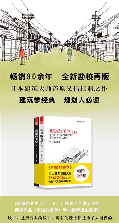街道的美學(上、下)收錄了日本著名建筑大師蘆原義信的兩部作品《街道的美學》和《續(xù)街道的美學》。文字都通俗易懂,作者把自己的理論用于了自己的建筑創(chuàng)作中,很有說服力。書中作者分析了外部空間,街道、景觀、住宅等,結(jié)合大量的實例。其中傳達著一個中心思想就是:城市,是所有人的城市,所有的設(shè)計都是為了人而做的。如同很多日本建筑師一樣,蘆原義信強調(diào)對人文精神的把握。