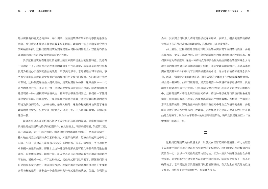 建筑是一種得了失語(yǔ)癥的哲學(xué)。原廣司曾毫不猶豫地預(yù)言——以建筑為代表的藝術(shù),將會(huì)取代哲學(xué),因?yàn)?1 世紀(jì),是“空間的時(shí)代”。 在書中,原廣司立足于“空間是一種權(quán)宜的解釋”的立場(chǎng),對(duì)各種現(xiàn)象做出解釋,在“辯證法”和“非而非”的基礎(chǔ)上,增加了新的東西,創(chuàng)造出無(wú)限的理論裝置,與之相輔相成。