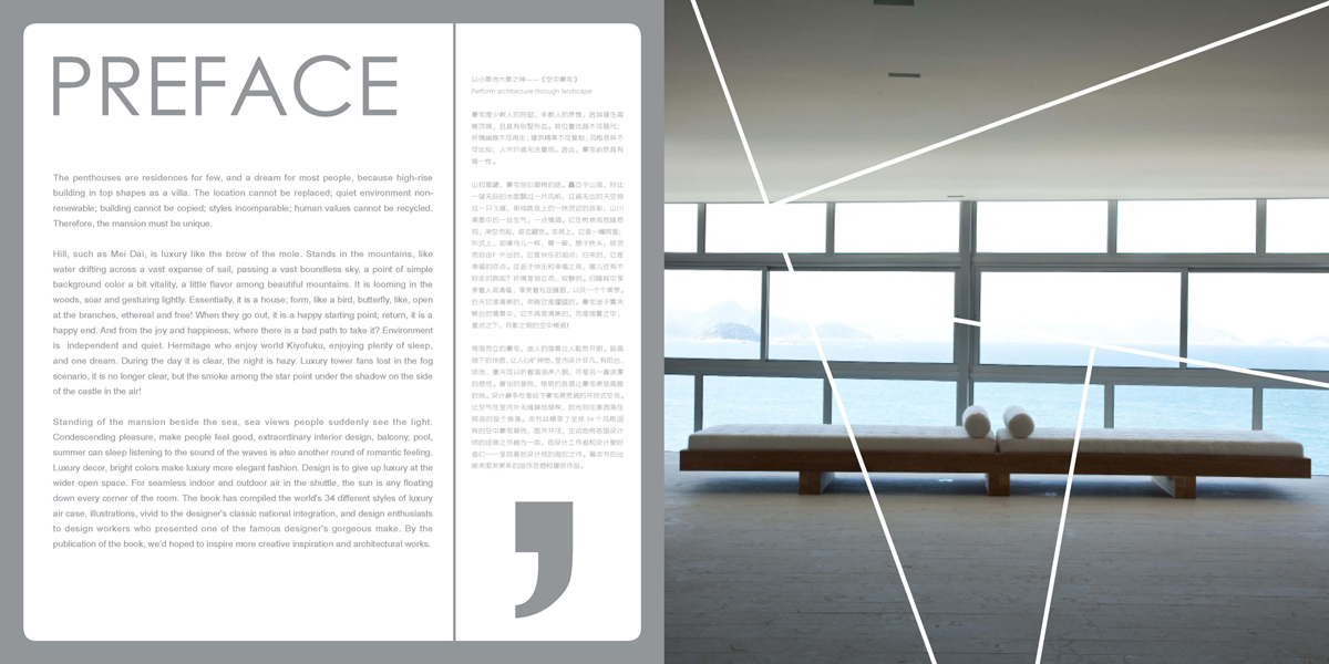 《都市桃源——空中豪宅》主要以世界各大城市市區(qū)高層高級住宅區(qū)得樣板豪宅為主,現(xiàn)在全球包括中國在內(nèi)的許多城市土地都非常稀少在市區(qū)的住宅主要傾向于高層住宅,現(xiàn)代城市人的生活水平在不斷提高,許多成功人士對生活品味極致追求,懸在半空中豪華舒適居所,讓人煥發(fā)了兒時般得夢幻即“夢幻天堂”的生活方式,同時一種居高臨下仰望美景不但顯示主人的成功也是至高的生活享受。所以高層中的超級豪宅應(yīng)韻而生,本書主要講敘就是一些知名城市的高層中的豪宅項目,像紐約,舊金山,倫敦,巴黎,首爾,新加坡,馬尼拉,香港,臺灣,上海,東京等各大城市的一些高層豪宅案例,本書將能給設(shè)計師提供許多低層或高層豪宅項目學(xué)習(xí)參考的靈感。