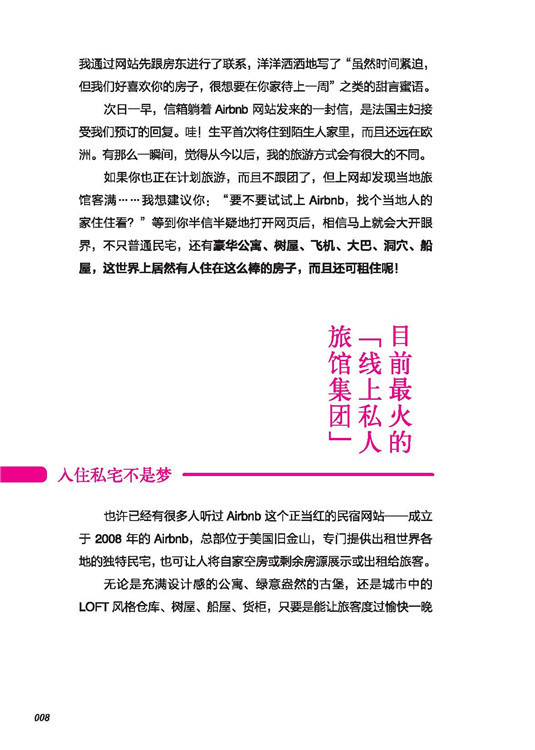 本書詳細的介紹了作者使用Airbnb入住全世界陌生人家里的情況,重點介紹了Airbnb平臺的使用方法,和陌生人家的入住體驗,詳細的介紹了自己利用Airbnb的省錢方式和其中遇到的陷阱,有利于其他使用Airbnb的人進行借鑒。后半部分還介紹了如何使用Airbnb平臺出租自己房子的步驟,想賺外快的讀者非常值得借鑒。