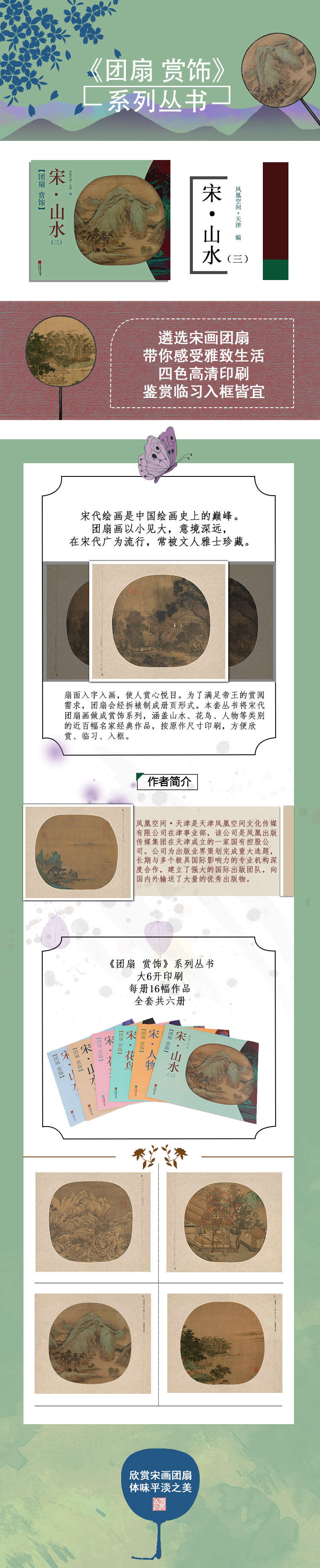 中國(guó)宋朝延續(xù)三百多年,民間繪畫、宮廷繪畫、士大夫繪畫各自形成體系,彼此間又相互影響、吸收、滲透,構(gòu)成宋代繪畫豐富多彩的面貌。本系類叢書將宋代團(tuán)扇畫做成賞飾系列,涵蓋山水、花鳥、人物等各類別,包括上百幅經(jīng)典作品,原作尺寸、高清印刷,供廣大讀者及愛好者欣賞、臨習(xí),亦可直接入框做裝飾用。如宋朝文人一樣,心中有山水,有一片屬于自己的山水。