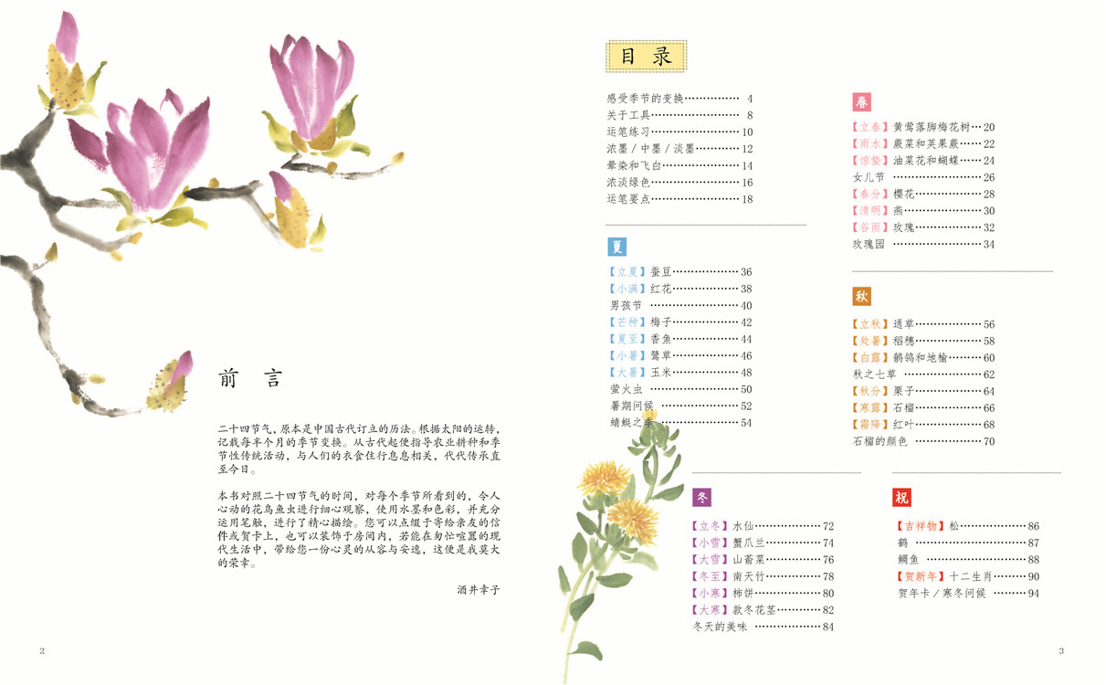 本書對(duì)照二十四節(jié)氣的時(shí)間,對(duì)每個(gè)季節(jié)所看到的,令人心動(dòng)的花鳥魚蟲進(jìn)行細(xì)心觀察,使用水墨和色彩,并充分運(yùn)用筆觸,進(jìn)行了精心描繪。您可以點(diǎn)綴于寄給親友的信件或賀卡上,也可以用于裝飾房間,若能在匆忙喧囂的現(xiàn)代生活中,帶給您一分心靈的從容與安逸,這便是我莫大的榮幸。