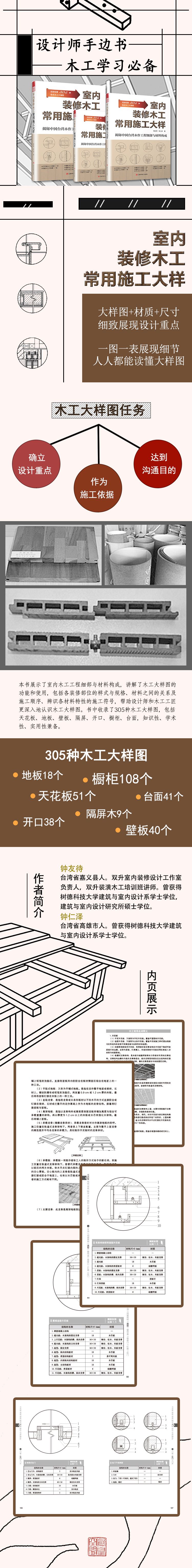 本書完整收錄了305種各式木工大樣圖,其中天花板木工大樣圖51個(gè)、地板木工大樣圖18個(gè)、壁板木工大樣圖40個(gè)、隔屏木工大樣圖9個(gè)、開(kāi)口木工大樣圖38個(gè)、櫥柜木工大樣圖108個(gè)和臺(tái)面木工大樣圖41個(gè)。本書詳細(xì)地講述了木工大樣圖應(yīng)該具備的功能和使用需求,同時(shí)也從確立設(shè)計(jì)重點(diǎn)、作為施工依據(jù)、達(dá)到溝通目的三個(gè)方面,講解了各裝修部位的樣式與規(guī)格、材料之間的關(guān)系及施工順序及辨識(shí)各材料特性的施工符號(hào),讓設(shè)計(jì)師和木工工匠能夠?qū)δ竟ご髽訄D有更加深入和清晰的認(rèn)知。本書兼?zhèn)渲R(shí)性、學(xué)術(shù)性和實(shí)用性,適合設(shè)計(jì)師及木工工匠進(jìn)行學(xué)習(xí)與參考,是國(guó)內(nèi)第一本專業(yè)木工施工大樣圖集,也是一本無(wú)可替代的木工設(shè)計(jì)權(quán)威用書。