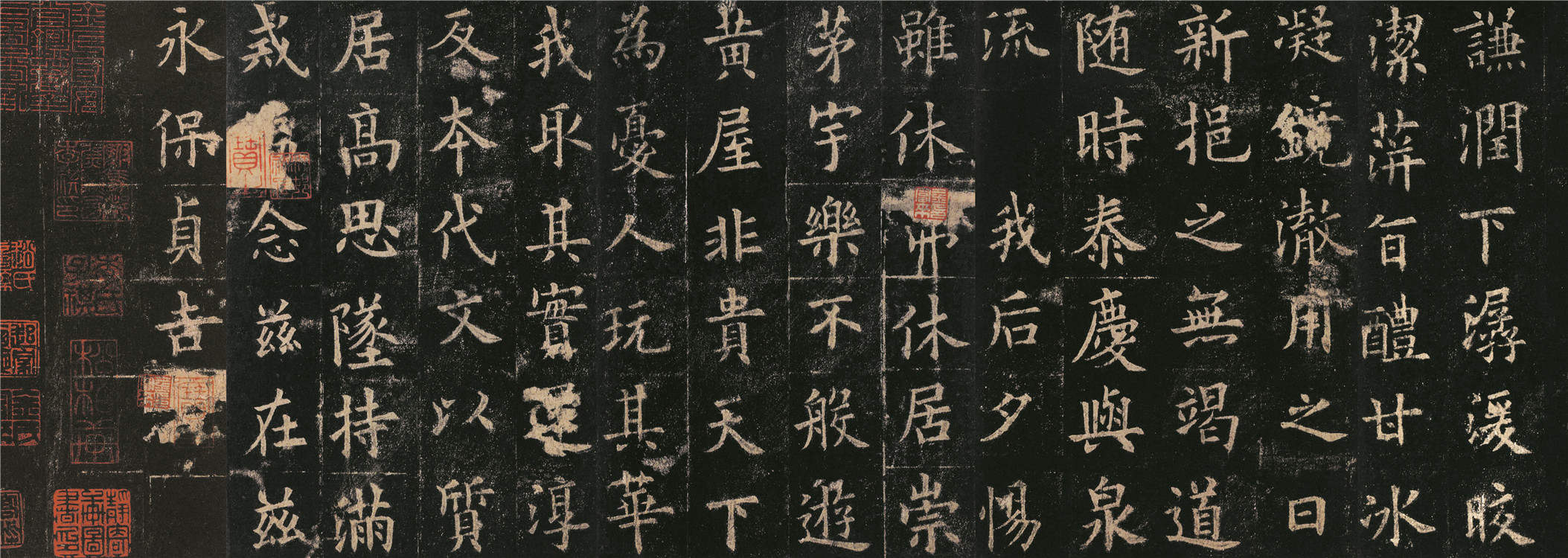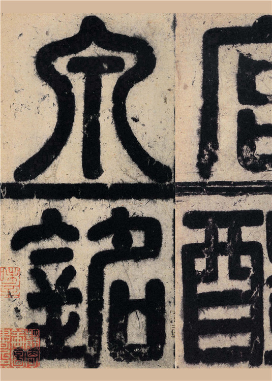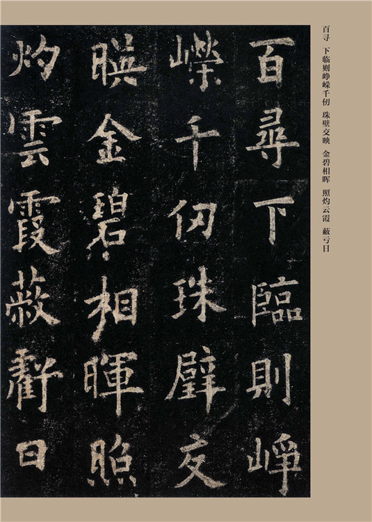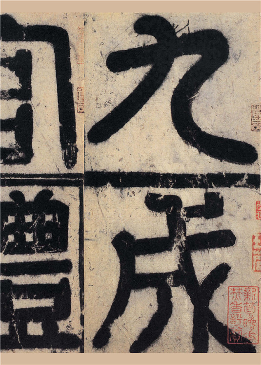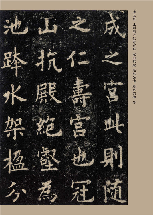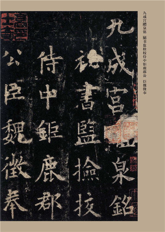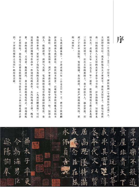 《九成宮醴泉銘》,于唐貞觀六年(公元632年)立。碑位于陜西麟游縣新城南九成宮遺址。傳世拓本很多,以明駙馬李琪所藏北宋拓本為最佳。其字最見神采,謹(jǐn)嚴(yán)中率意靈動(dòng),規(guī)矩中別具一格,如深山道人,瘦硬清寒,而神氣充腴。筆畫粗細(xì)變化中飽含精妙的筆法,布勢(shì)極盡參差,更顯示了化險(xiǎn)為夷的藝術(shù)匠心?!毒懦蓪m醴泉銘》可以說是初唐時(shí)期楷書作品中一件劃時(shí)代的杰作,從風(fēng)格構(gòu)成上講,既有篆、隸的筆意,又有晉、魏的遺風(fēng)。兼方帶圓的用筆特式,結(jié)構(gòu)搭配平正而險(xiǎn)絕,由此也可以看出歐陽詢?cè)跁ㄊ飞稀吧铣辛北囗?,下開唐代楷體之先河”的歷史貢獻(xiàn)。