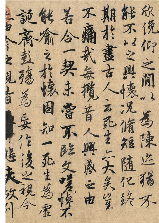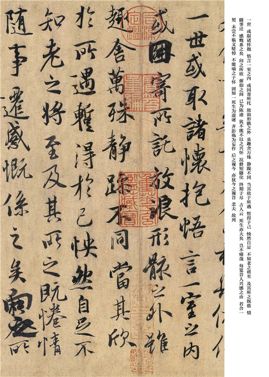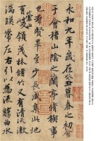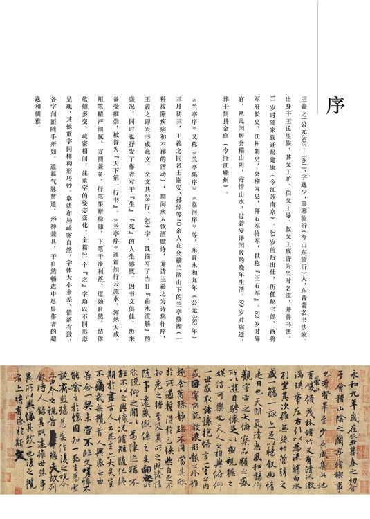 《蘭亭序》又稱《蘭亭集序》《臨河序》等,東晉永和九年(公元353年)三月初三, 王羲之同名士謝安、孫綽等40余人在會稽蘭渚山下的蘭亭修褉(一種祓除疾病和不祥的活動),期間眾人飲酒賦詩,并請王羲之為詩集作序,王羲之即興書成此文。全文共28行、324字,既描寫了當(dāng)日“曲水流觴”的盛況,同時也抒發(fā)了者對于“生”“死”的人生感慨。因書文俱佳,歷來備受推崇。