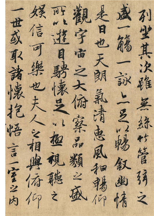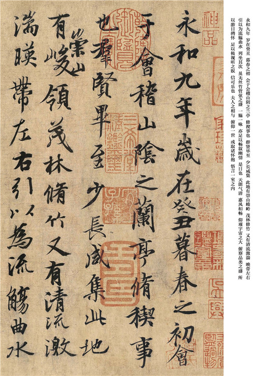 《蘭亭序》通篇如行云流水,渾然天成。用筆精嚴(yán)細(xì)膩、方圓兼?zhèn)?,行筆果斷穩(wěn)健,下筆干凈利落、道勁自然。結(jié)體欹側(cè)多變、疏密相間,注重字的姿態(tài)變化,全篇21個“之”字均以不同形態(tài)呈現(xiàn),其他重字同樣構(gòu)形巧妙。章法布局疏密自然,字體大小參差、錯落有致,各字間距隨手所如。通篇氣脈貫通、形神兼具,于自然暢達(dá)中盡顯作者的超逸和儒雅。