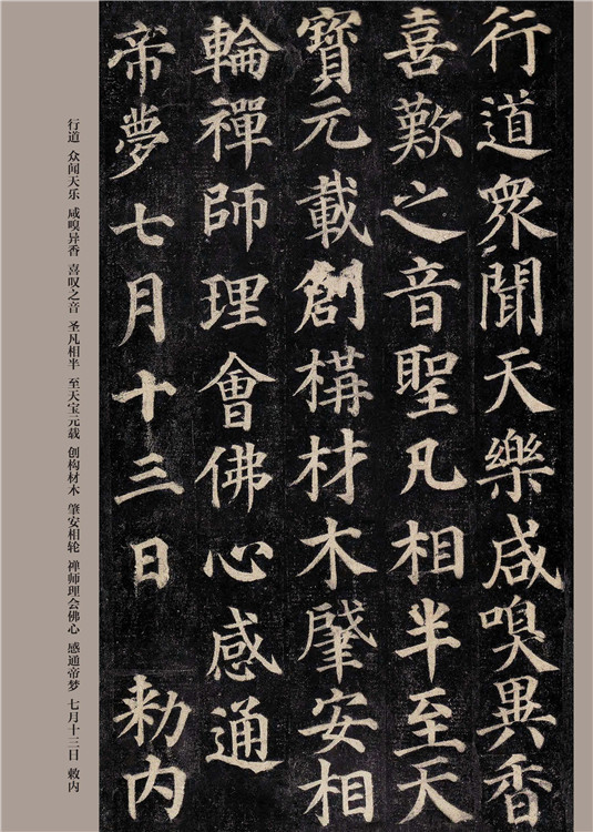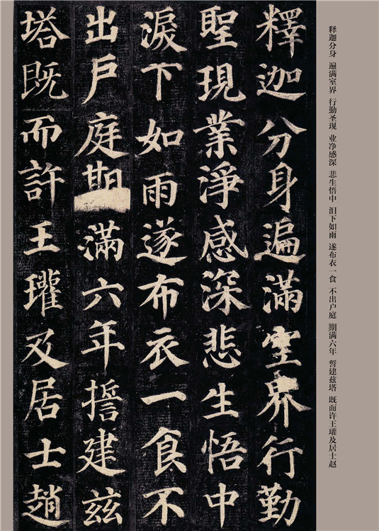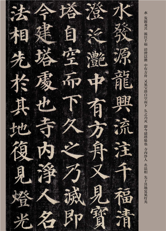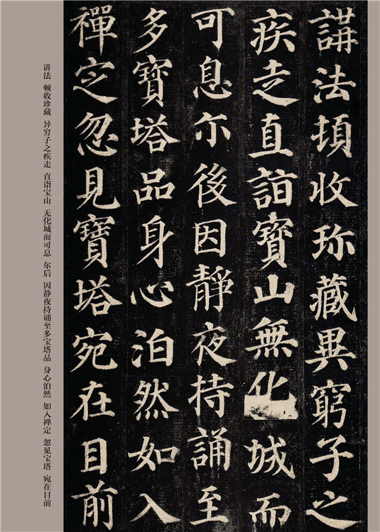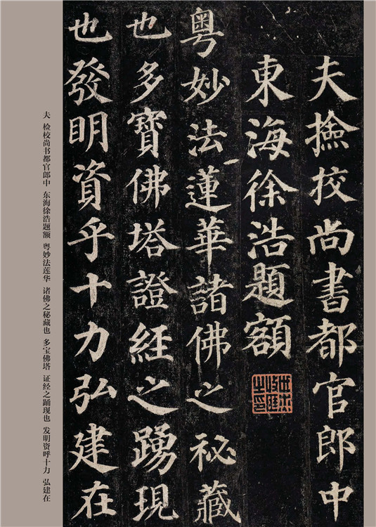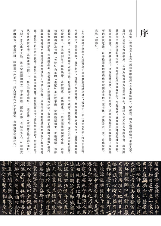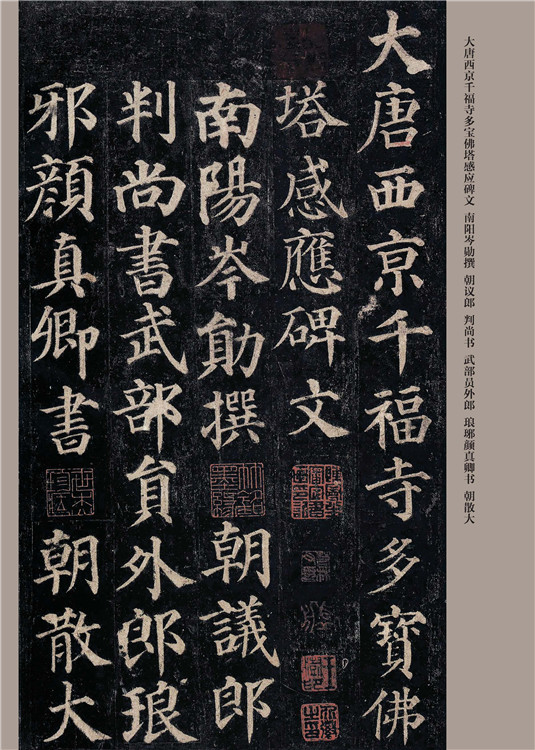 《多寶塔碑》全稱《大唐西京千福寺多寶塔感應(yīng)碑》,天寶十一年(公元752年)四月廿日建,岑勛撰文,徐浩題額,史華刻字,現(xiàn)藏于西安碑林,是顏真卿44歲時(shí)所書,也是顏真卿傳世最早之碑?!抖鄬毸伏c(diǎn)畫豐腴,用筆勁健,結(jié)字茂密,體勢(shì)端莊。其中的點(diǎn)運(yùn)用靈活,引帶顧盼;各筆畫間時(shí)有露鋒映帶,連貫照應(yīng),正斜相生;一些主豎故意偏離中線,而靠長(zhǎng)橫的斜勢(shì)及長(zhǎng)的 “力臂”和重的“垂尾”來獲取平衡,使得穩(wěn)活相生,奇趣頓增。書體雖筆力雄渾厚重,卻墨酣意足,在筆墨流動(dòng)處頗顯媚秀之姿,也成就 了顏楷的“雄媚”書風(fēng)。顏真卿的楷書平畫寬結(jié)顯然是汲取了漢隸之體勢(shì),點(diǎn)畫渾厚而蒼勁顯然是汲取了篆書的筆意,看似平正但絕不板滯,看似豐肥而實(shí)具風(fēng)骨,看似濁而實(shí)清,看似拙而實(shí)巧,莊而不險(xiǎn),從容從法度中來。蘇軾評(píng)其書謂:“一魯公書雄秀獨(dú)出,一變古法?!睔W陽(yáng)修《集古錄》亦曰:“斯人忠義出于天性,故其字畫剛勁獨(dú)立,不襲前跡,挺然奇?zhèn)?,有似其為人?!庇^顏真卿的楷書,字里行間,洋溢著一種正氣,如大臣正色嚴(yán)立于廟堂,有凜然不可犯之色。