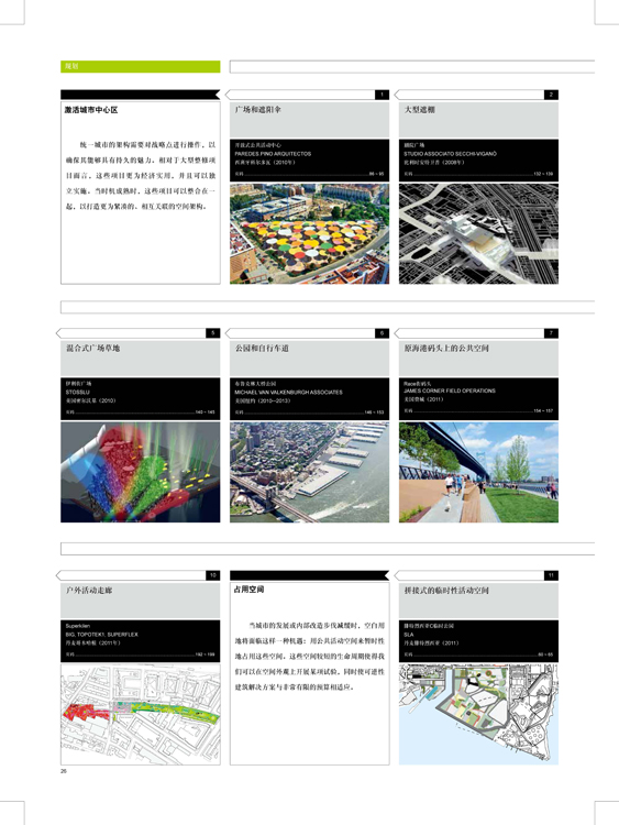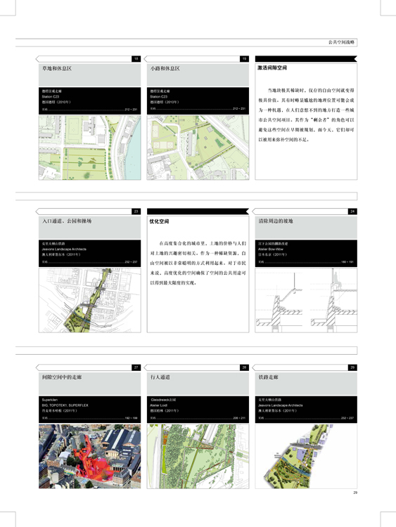 一本既有“戰(zhàn)略”又有“戰(zhàn)術”的設計書,大的“戰(zhàn)略”用來保證空間的完整性和正確性,細微的“戰(zhàn)術”則可以完善空間的實用性及美觀性,作者將設計的方向和途徑統(tǒng)一做出解釋說明。每個大的“戰(zhàn)略”下設多種“戰(zhàn)術”方法,從不同角度分析城市公共空間的設計原則與方法,具有很強的實操性。