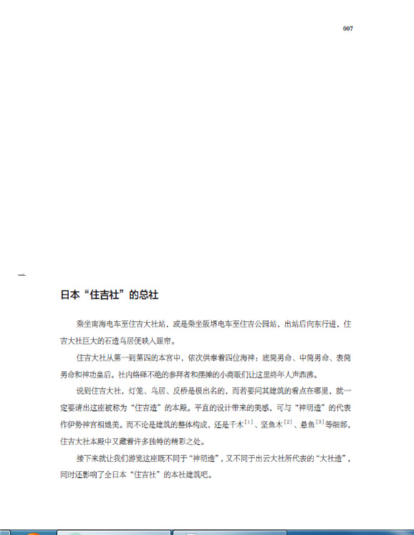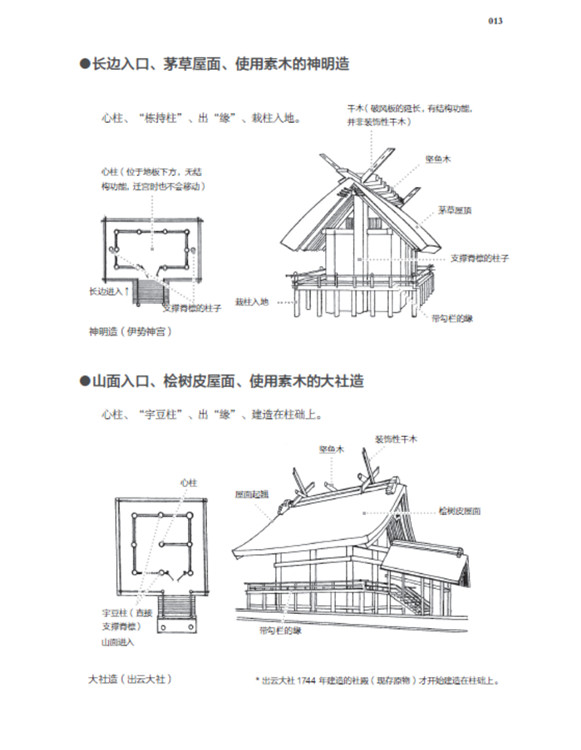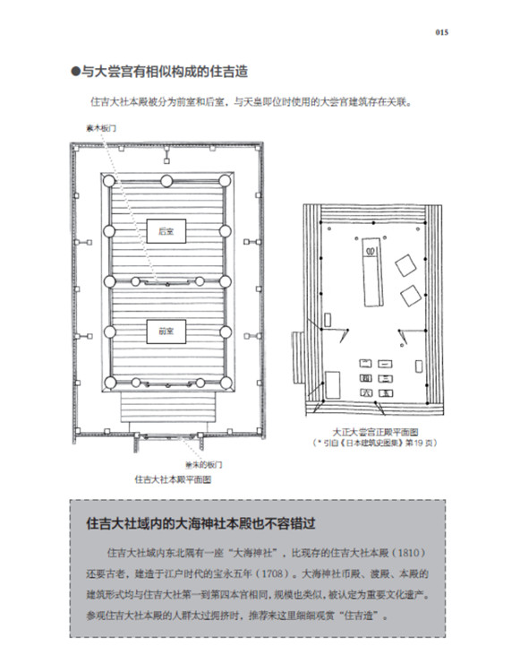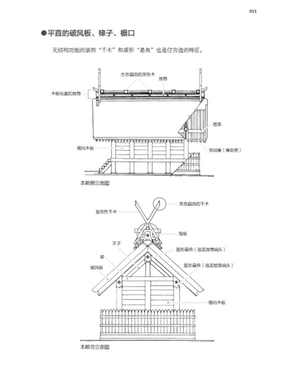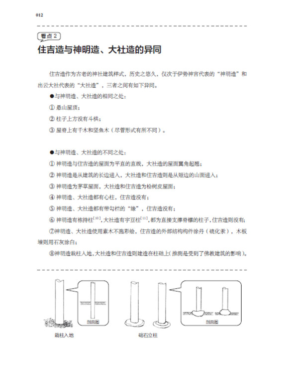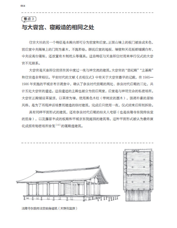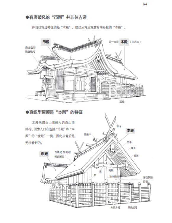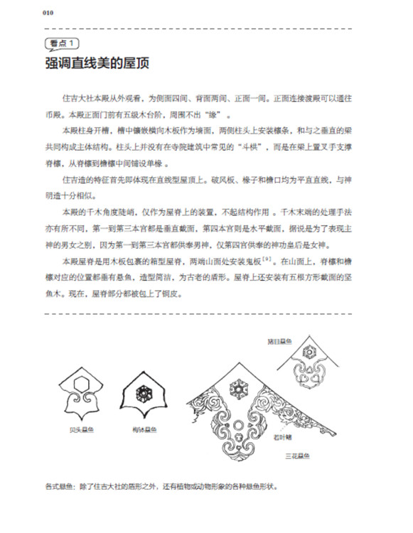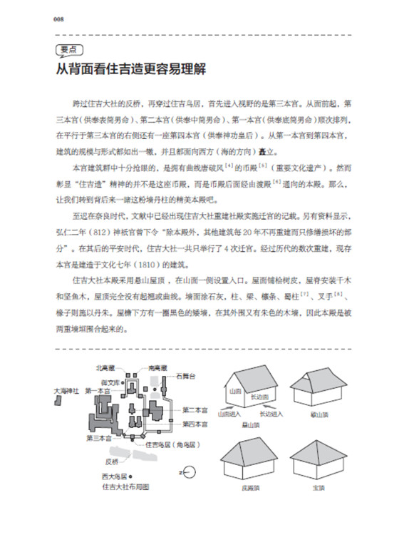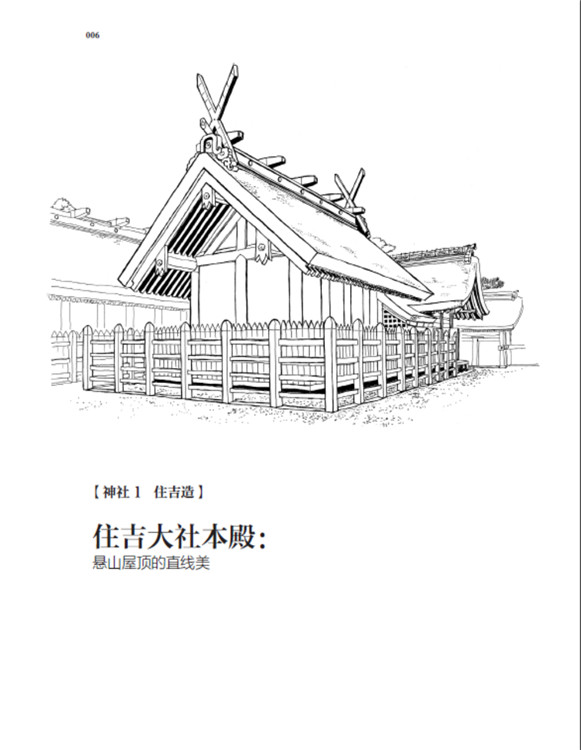 本書(shū)將日本古建筑中的神社、寺院、書(shū)院三部分,按照建筑樣式細(xì)分成住吉造、春日造、流造、日吉造、八坂造、飛鳥(niǎo)樣式、和式、大佛樣、禪宗樣、折中樣等14種建筑樣式在住吉大社本殿,領(lǐng)略懸山屋頂?shù)闹本€美