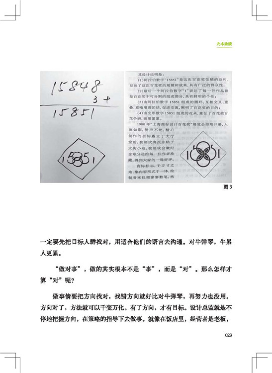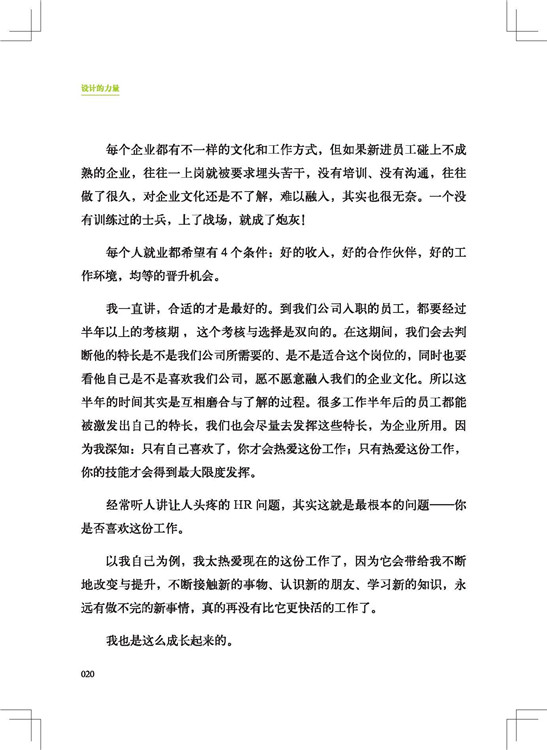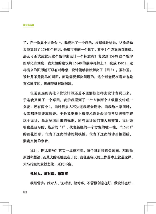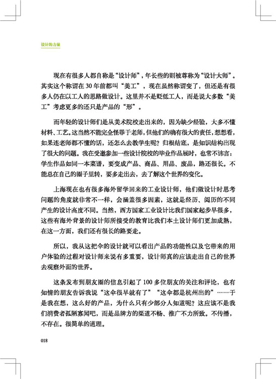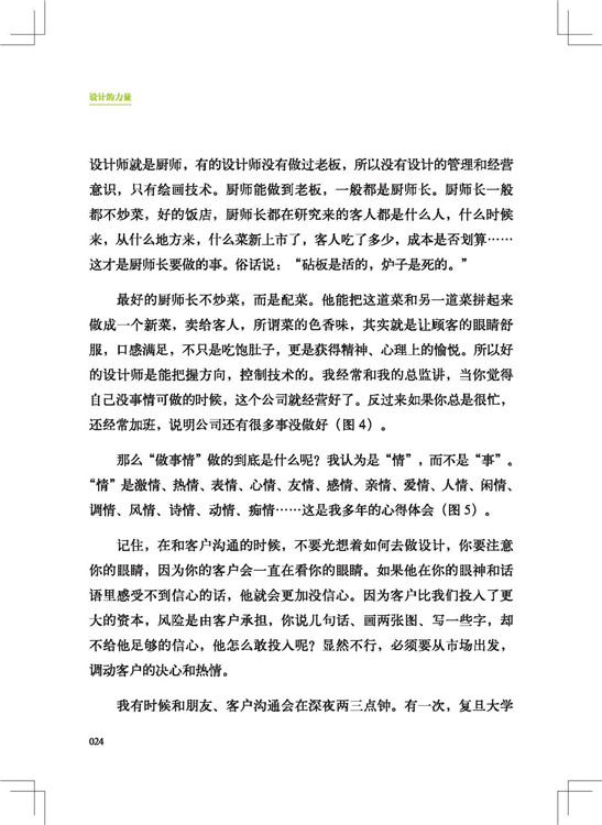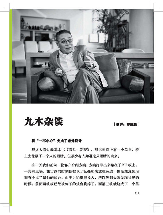 這本書以訪談形式來分享作者職業(yè)生涯中的設(shè)計項目經(jīng)驗,講解其親身經(jīng)歷的大項目過程,展示其幾十年總結(jié)的獨有的創(chuàng)意觀。通過十個話題來講述設(shè)計師對平面設(shè)計、產(chǎn)品設(shè)計以及室內(nèi)設(shè)計的理解與感受,以及用戶的體驗態(tài)度。并深入淺出地道出設(shè)計的理念,直擊設(shè)計的本質(zhì)。這也是樹立品牌形象,傳播品牌影響力,積累品牌資產(chǎn)的核心要素。同時作者還提到了創(chuàng)造性思維在設(shè)計中的重要性,這種思維模式不僅給設(shè)計師靈感與啟發(fā),同時也給用戶滿意的體驗與享受。