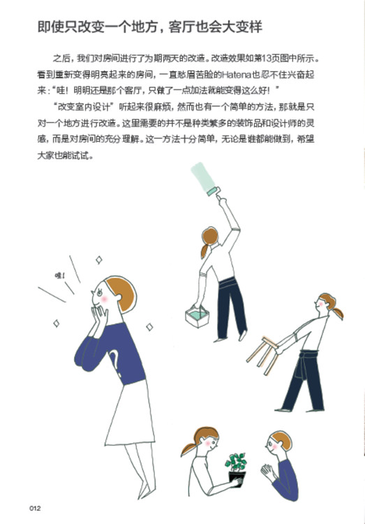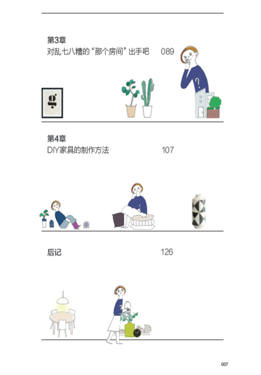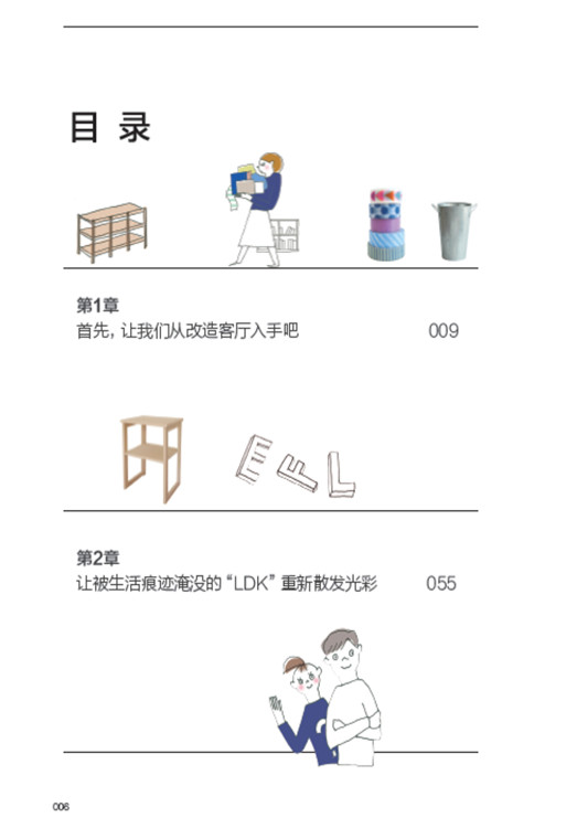 本書分為“首先,讓我們從改造客廳入手吧 ”“ 讓被生活痕跡淹沒的‘LDK’重新散發(fā)光彩”“ 對(duì)亂七八糟的‘那個(gè)房間’出手吧”“DIY家具的制作方法”四個(gè)章節(jié),以手繪漫畫的形式解說詳細(xì)闡述了廚房、客廳、臥室、衛(wèi)生間、玄關(guān)等收納整理技巧和室內(nèi)設(shè)計(jì)創(chuàng)意,消除家中乏味的生活痕跡,讓改造后的家重新煥發(fā)光彩。