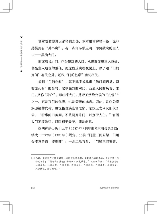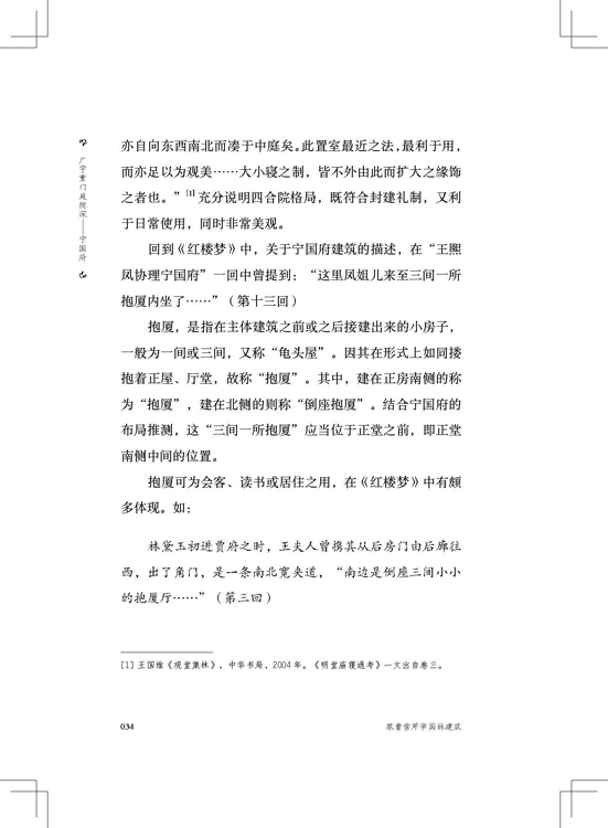 本書提煉出經(jīng)典文學(xué)作品《紅樓夢》中的園林、建筑部分加以描述,內(nèi)容依據(jù)主要人物的住所院落劃分,重點圍繞大觀園的園林布局、榮寧兩府內(nèi)主要院落建筑展開描寫,涉及怡紅院、瀟湘館、蘅蕪苑等主要人物的居住活動場所,作者談古論今,旁征博引,淋漓盡致地描繪出古典園林建筑的藝術(shù)感。本書將園林和建筑之間的關(guān)系做了清晰的分析說明,在對《紅樓夢》這本書中的園林建筑進行描寫的同時,結(jié)合我國現(xiàn)存的古典園林建筑,從多個角度分析他們的差異和共性,并結(jié)合時代特點,引申到現(xiàn)代的園林建筑設(shè)計上來,一方面幫助設(shè)計師領(lǐng)會中國古典園林建筑的工藝美,體會古人的智慧和高超技藝,另一方面給紅學(xué)愛好者打開了另外一個角度來研讀《紅樓夢》,即使是普通的大眾讀者,讀來也會獲益匪淺。