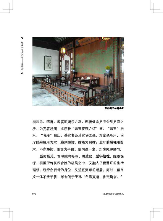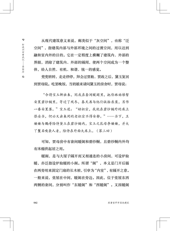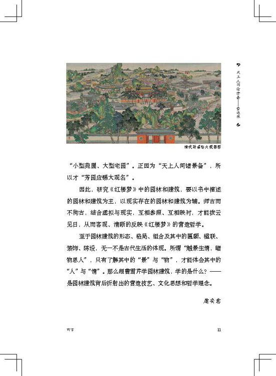 本書作者是建筑專業(yè)出身,同時也是一位紅學(xué)愛好者,作者以獨特的角度,描繪出《紅樓夢》中的人物居住環(huán)境,結(jié)合了文學(xué)藝術(shù)和園林建筑藝術(shù),文學(xué)性與藝術(shù)性兼具,一方面挖掘文學(xué)作品中的園林藝術(shù)、建筑藝術(shù),另一方面結(jié)合《紅樓夢》中的人物特性、故事情節(jié)來描述園林建筑的設(shè)計,兩者相輔相成,通過對多個不同領(lǐng)域相結(jié)合的描寫敘述,為讀者展開了較深入地解析。通過作者多年對《紅樓夢》的研讀和堅實的專業(yè)基礎(chǔ),引導(dǎo)讀者進入書中的園林建筑世界?!都t樓夢》作為一部經(jīng)典文學(xué)作品,已被諸多紅學(xué)大師進行過分析研讀,但正所謂“一千個人心中有一千個哈姆雷特”,建筑師眼中的《紅樓夢》更多地承載了我國建筑歷史的文化和精髓,古典建筑肯定與園林脫不開聯(lián)系,因此作者將兩者穿插描述,更便于讀者理解學(xué)習(xí)。