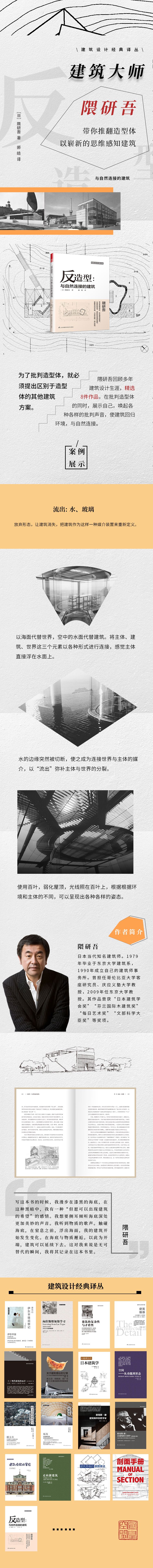 本書將通過精選的八件作品,感受建筑大師的設(shè)計理念,在隈研吾的引領(lǐng)下推翻造型體,以嶄新的思維、全新的角度感知建筑,聆聽建筑的歌聲。