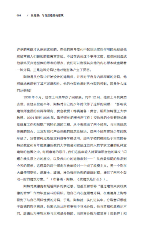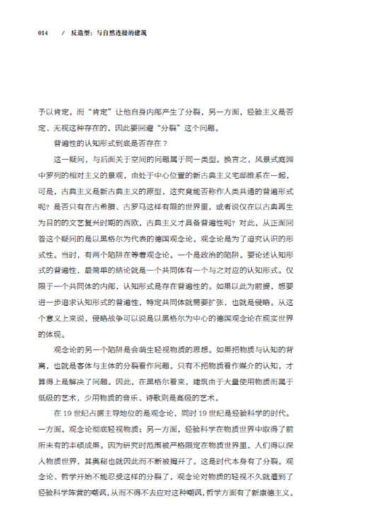 本書中,隈研吾回顧多年建筑設(shè)計生涯,批判了批判一下以自我為中心的建筑,批判了建筑的分割,試圖推翻造型體,以嶄新的思維、全新的角度感知建筑,使建筑回歸環(huán)境,與自然連接,得以延續(xù)。
