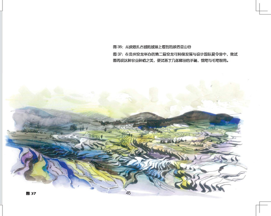 這是一本作者的景觀手繪作品集,整理了作者在旅行中的所繪的各種植物、風(fēng)景、建筑。鄉(xiāng)村。田野。同時(shí)作品涵蓋作者旅途中的大型空間布局分析,中外園林植物速寫,各地方的園林景觀風(fēng)貌速寫。大到世界知名廣場(chǎng)空間鳥(niǎo)瞰圖,小到雕塑,甚至建筑結(jié)構(gòu)的木雕裝飾圖描繪。此外,還包含一些江南古鎮(zhèn)風(fēng)景、建筑與民居院落,貴州梯田、村落與農(nóng)家院落的手繪圖。作者回歸設(shè)計(jì),對(duì)其進(jìn)行推敲、構(gòu)思,并落實(shí)到親身參與的安龍村落景觀規(guī)劃設(shè)計(jì)項(xiàng)目中。
