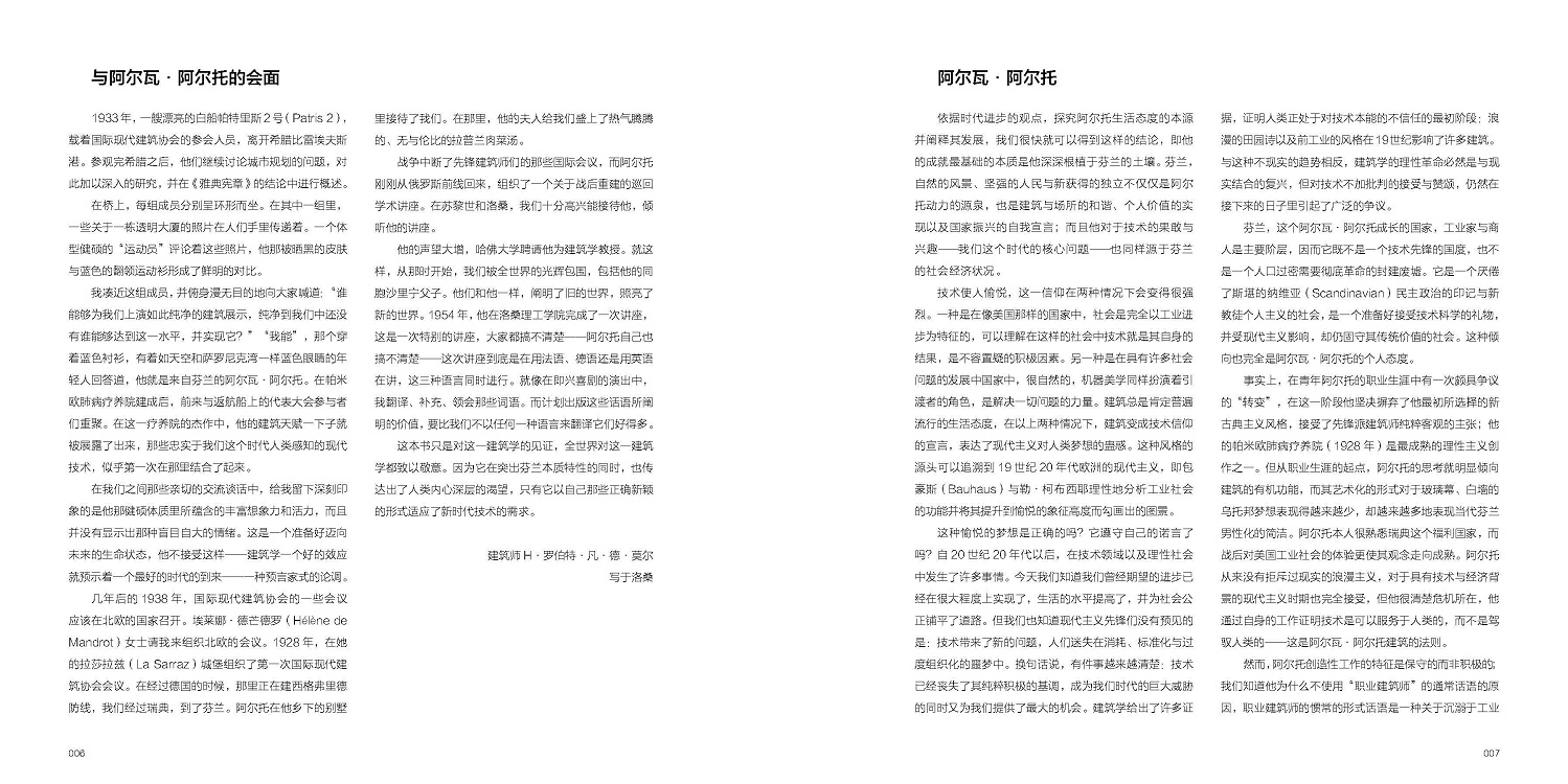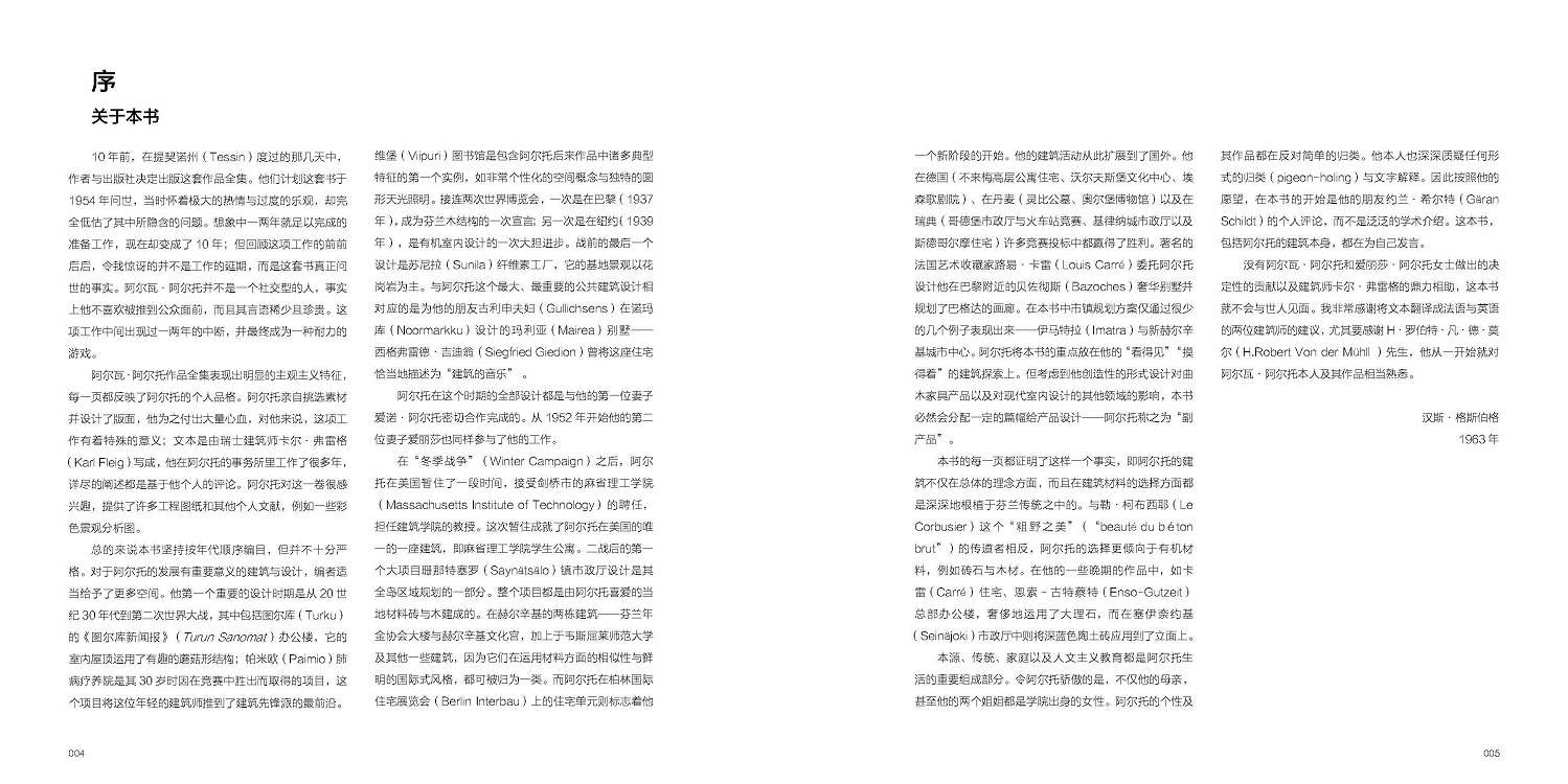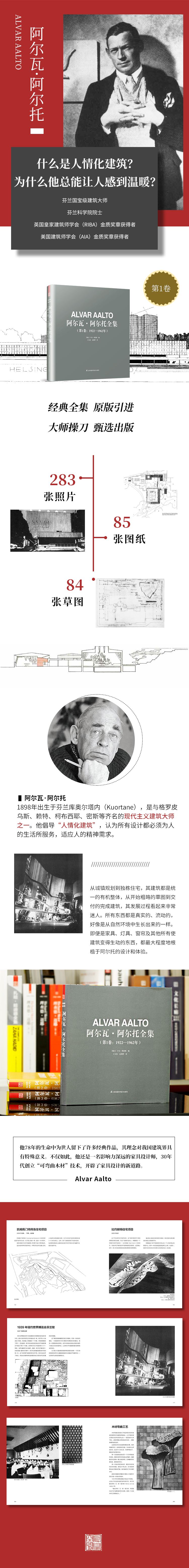 本卷外文原版出版于1963年,是這位大師作品集的第1卷,收錄從1922—1962年的建筑設(shè)計(jì)與規(guī)劃案例,從1929年建成位于圖爾庫(kù)的芬蘭劇院,到1962年的新赫爾辛基城市中心方案,通過(guò)280余張照片,近200張?jiān)O(shè)計(jì)圖紙和草圖,按時(shí)間順序?yàn)樽x者展示。本書(shū)并沒(méi)有將阿爾托的建筑設(shè)計(jì)歸類于某種風(fēng)格或流派,也沒(méi)有對(duì)他的作品小題大做,只是將他的建筑設(shè)計(jì)忠實(shí)、客觀、簡(jiǎn)要地展示與陳述給讀者。