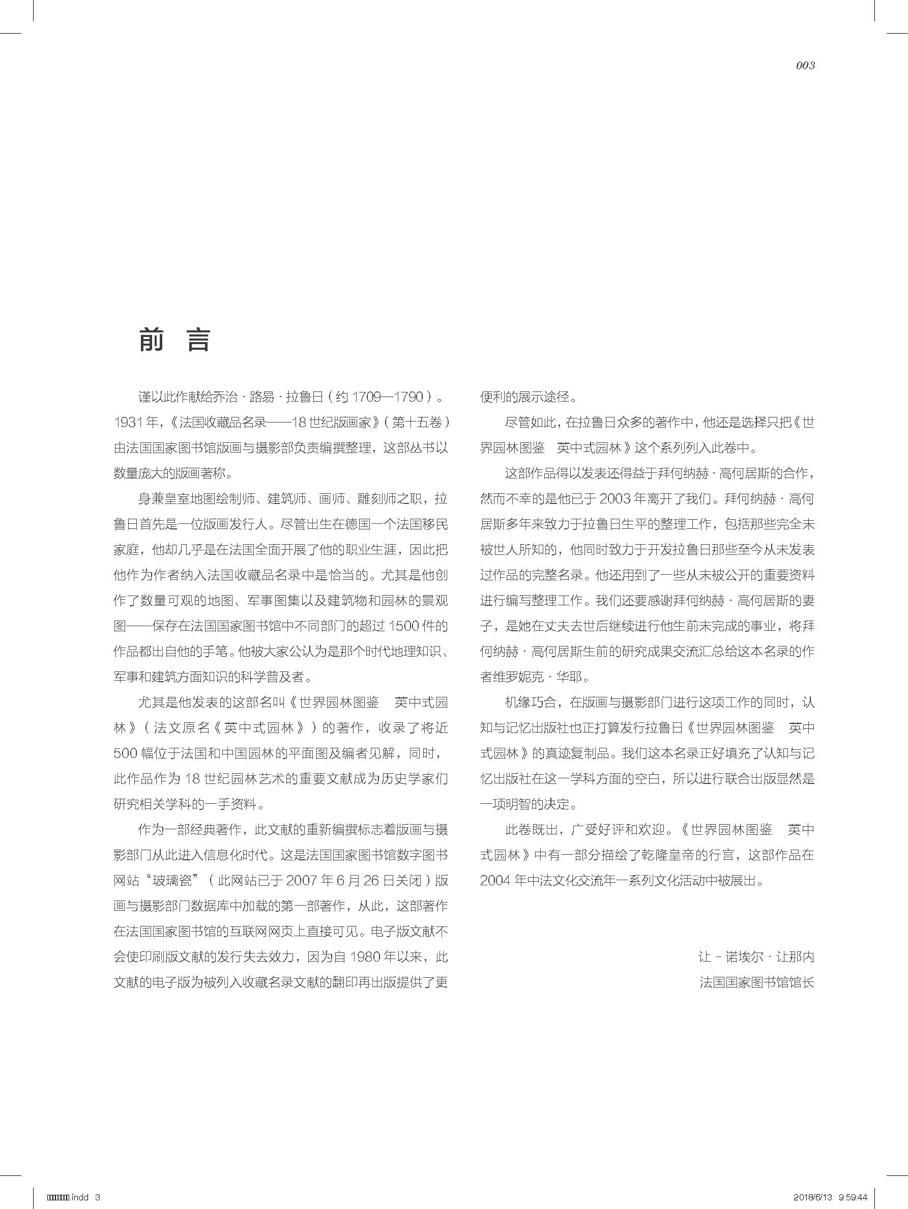 本書收錄了將近500幅位于歐洲和中國的園林平面圖及編者見解,同時(shí),此作品作為18世紀(jì)園林藝術(shù)的重要文獻(xiàn)成為歷史學(xué)家們研究相關(guān)學(xué)科的一手資料。全書分為二十一冊,按照拉魯日出版年份順序編排,其中包含邱園、斯陀園、圓明園等世界聞名的經(jīng)典園林。