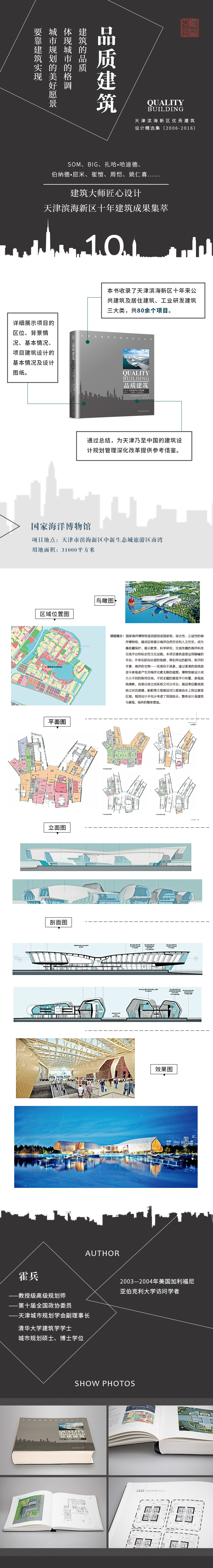 《品質(zhì)建筑——天津濱海新區(qū)優(yōu)秀建筑設(shè)計精選集(2006-2016)》 對新區(qū)十年來各區(qū)域新建的建筑做了初步的梳理,把公共建筑中的對外交通建筑單獨作為一個大類,其他文化藝術(shù)、商務(wù)辦公、商業(yè)、教育、醫(yī)療衛(wèi)生等公共建筑都納入公共建筑類。居住建筑量比較大,有部分設(shè)計水平比較高,還有一些創(chuàng)新,包括社區(qū)建筑。工業(yè)研發(fā)建筑是濱海新區(qū)的特色,其中有一些大項目,高標(biāo)準(zhǔn)的廠房和研發(fā)樓的設(shè)計很有水平。由于篇幅的限制,我們反復(fù)比選,難以取舍,最后忍痛割愛,選擇了其中的80個項目納入本書,分為公共建筑、居住建筑和工業(yè)研發(fā)建筑三類,逐一做重點介紹。