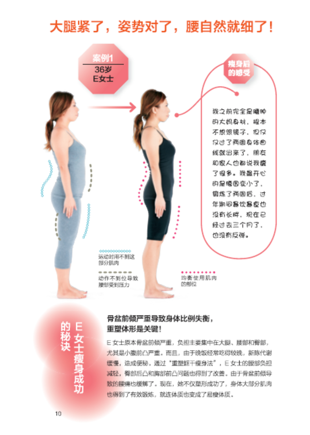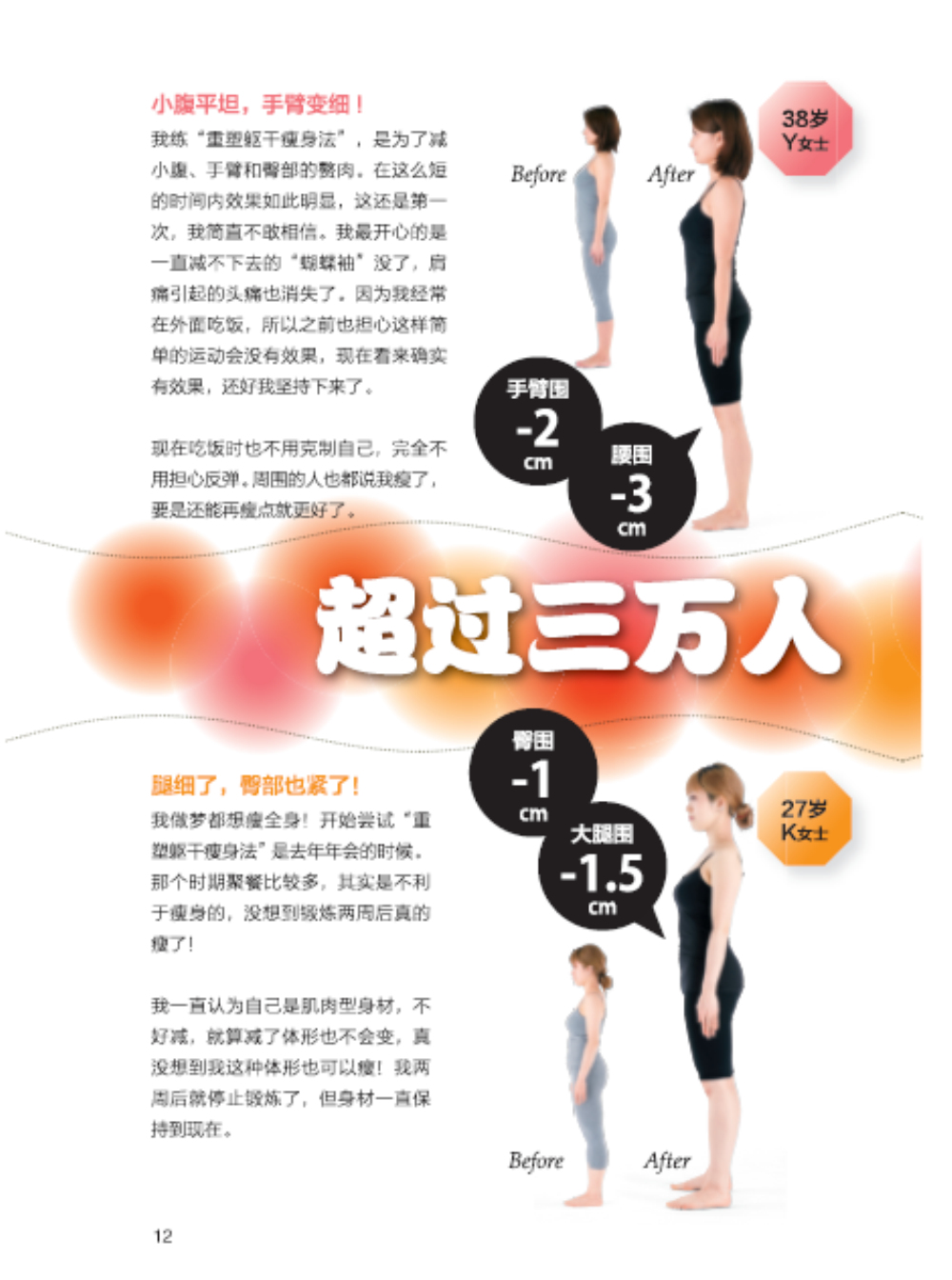 ★骨盆前傾、小腹前凸、小腹贅肉、蝴蝶袖等瘦身難題逐一突破,兩周即有明顯變化,即使停止練習(xí),也不反彈。