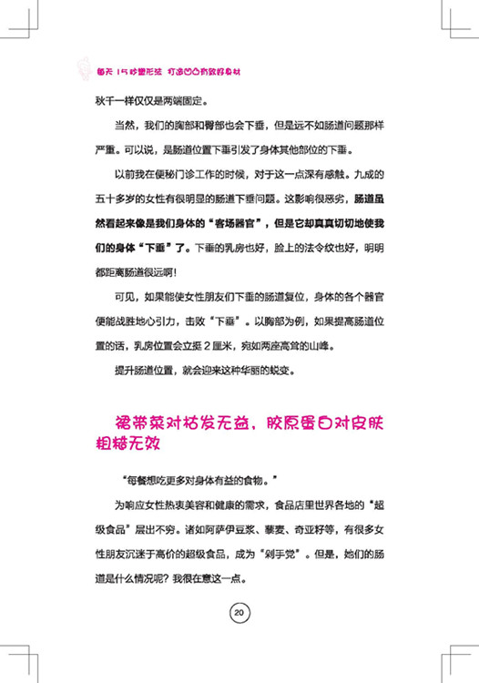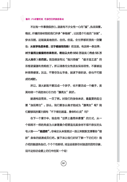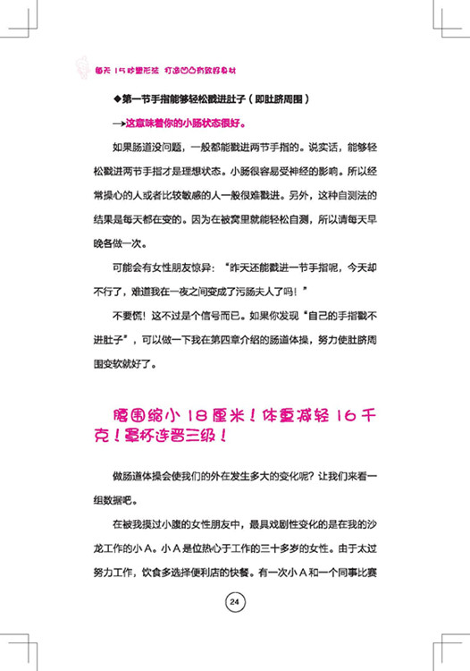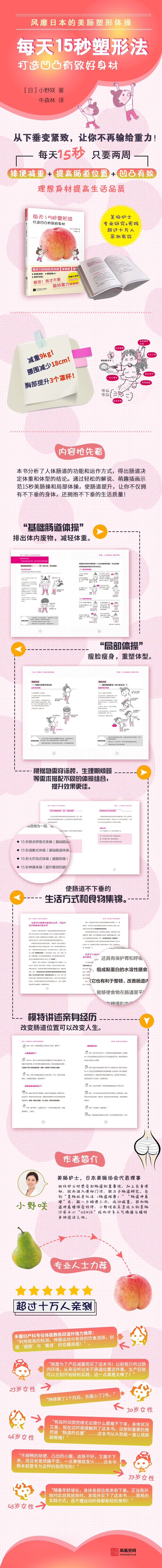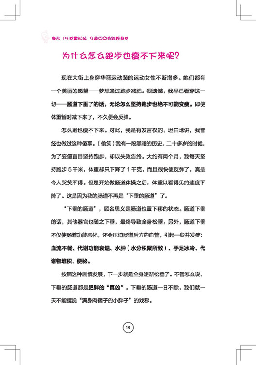 本書(shū)以女性身體不斷下垂的苦惱開(kāi)篇,通過(guò)分析人體腸道的功能和運(yùn)作方式,得出腸道決定體重和體型的結(jié)論。接著,詳細(xì)解說(shuō)作者研發(fā)的15秒美腸操,讓腸道回到原本的位置。“基礎(chǔ)腸道體操”排出體內(nèi)廢物,減輕體重,“局部體操”重塑體型,打造凹凸有致好身材。此外,再搭配使腸道不下垂的生活方式和食物集錦,收獲不下垂的生活品質(zhì)。最后,收錄美腸沙龍女子座談會(huì),東京的模特紛紛感嘆改變腸道位置可以改變?nèi)松?