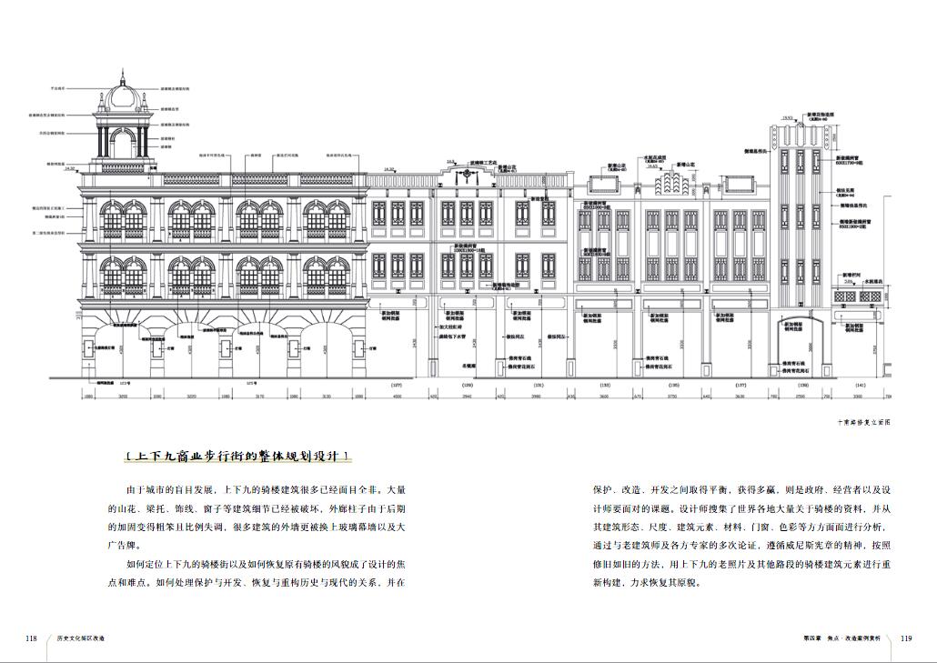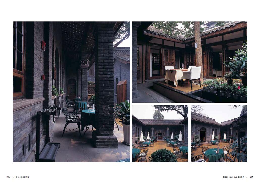 全書共四章,總體可分為兩大部分,開章先是由大范圍到小范圍介紹了關(guān)于歷史文化街區(qū)的理論知識(shí),包括保護(hù)思想的溯源、與之相關(guān)的歷史環(huán)境、一些基本概念、相關(guān)保護(hù)規(guī)劃及改造原則等,讓讀者對(duì)歷史文化街區(qū)的認(rèn)識(shí)由淺入深;書中的最后一部分則是結(jié)合歷史文化街區(qū)改造的具體案例進(jìn)行分析,主要是選取了在保護(hù)基礎(chǔ)上成功進(jìn)行了商業(yè)引導(dǎo)、重新煥發(fā)活力的歷史文化街區(qū),從基本歷史概況、改造設(shè)計(jì)方案、細(xì)部施工技術(shù)等方面來詳盡說明,還加插了各種設(shè)計(jì)方案圖紙、大量精美的改造效果圖片以及現(xiàn)場施工圖片,給予讀者更直觀的感受。