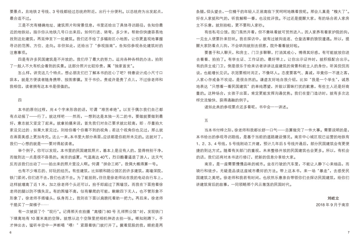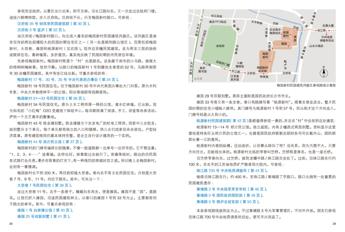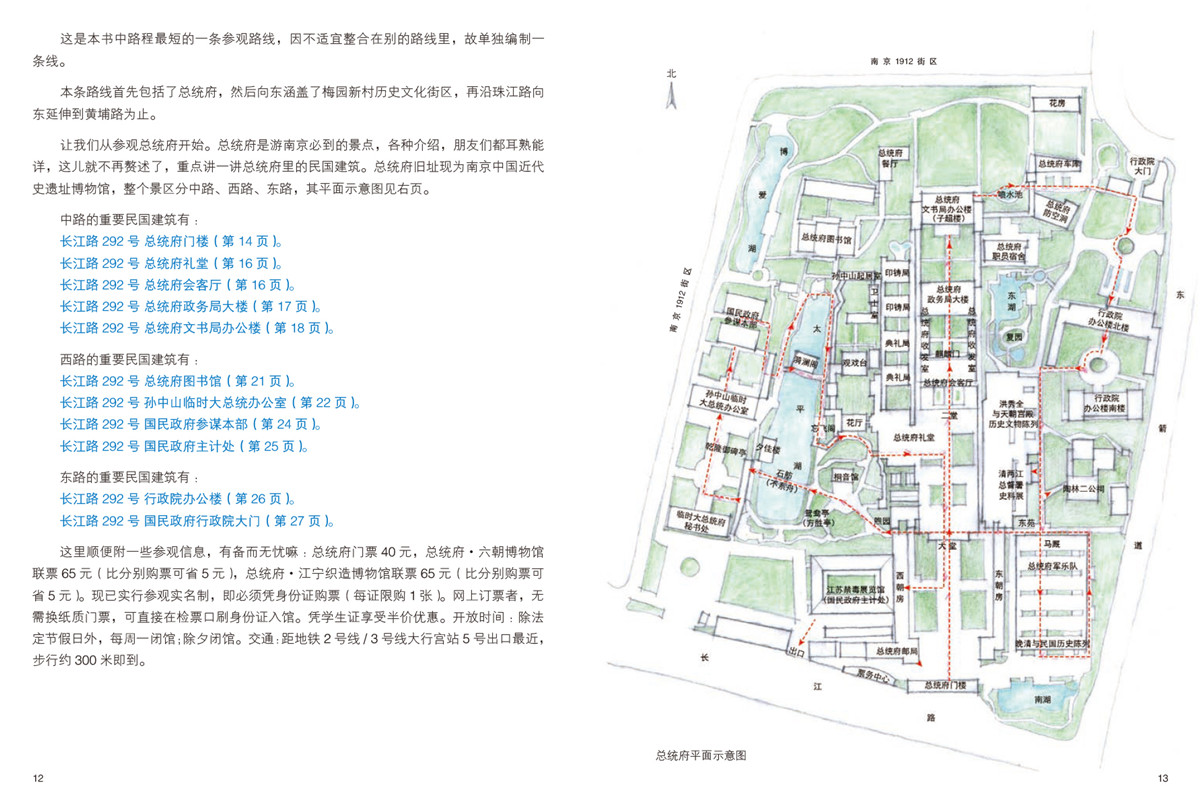 書中將南京民國建筑按街巷沿線門牌號碼,一個不漏地有一處講一處。不僅提供每處建筑的精確地址、背景信息和欣賞看點,還給出了具體尋訪路徑,細致到告知你最近的地鐵站的幾號口、如何轉彎、相距多少米,且手繪了多幅街巷小地圖,便于讀者按圖索驥。作者還以親身經驗,給出了參觀每處建筑的注意事項。