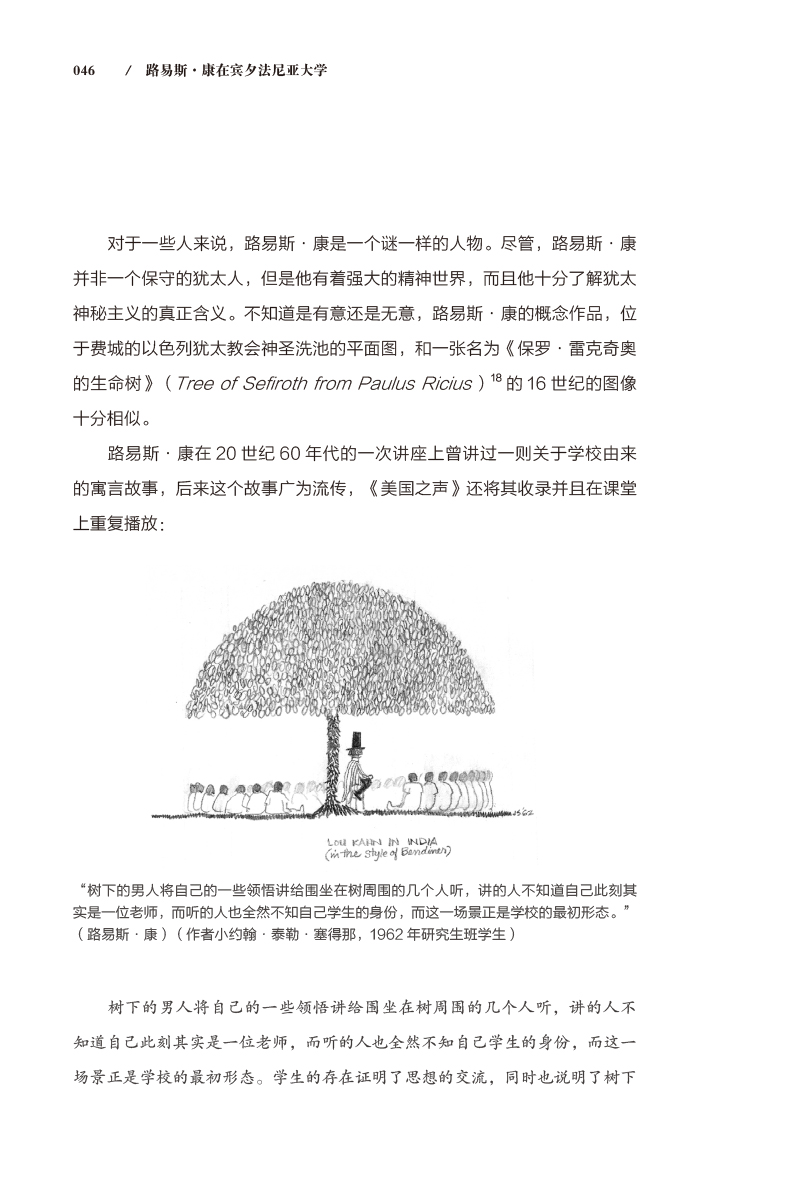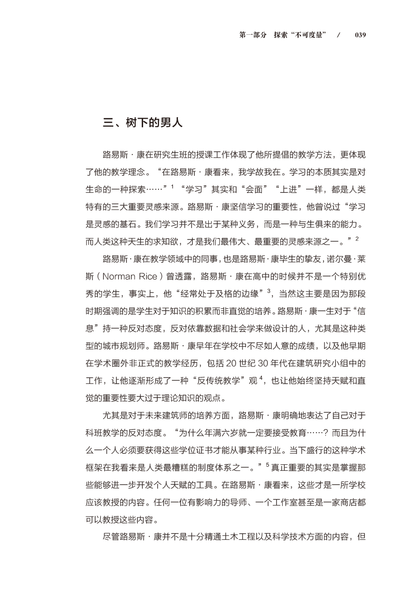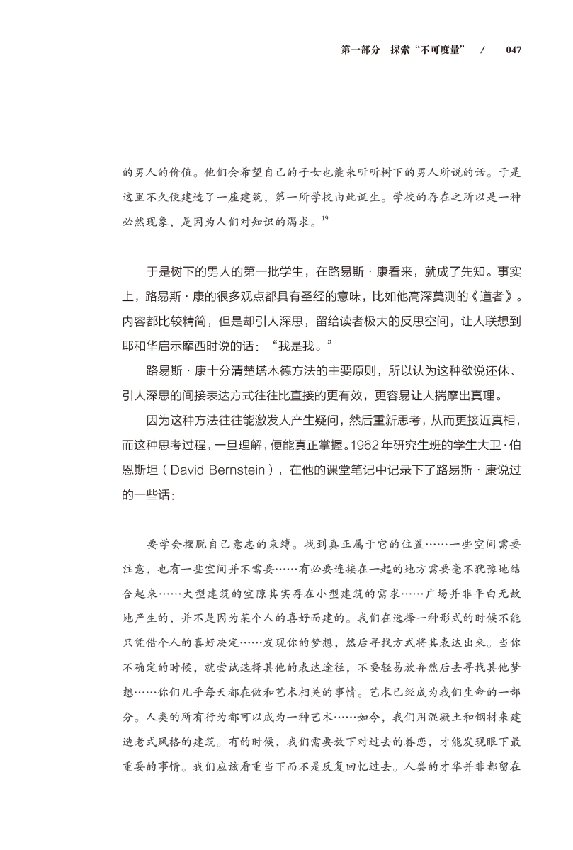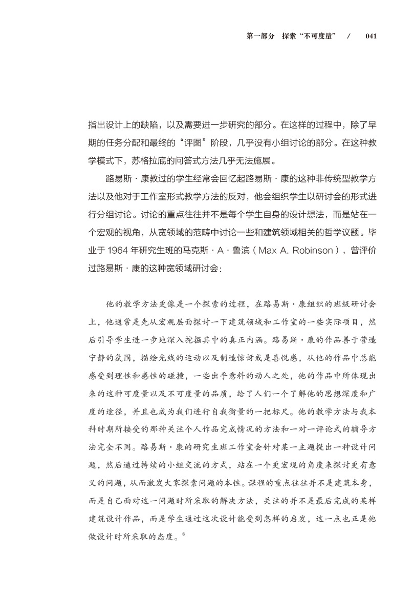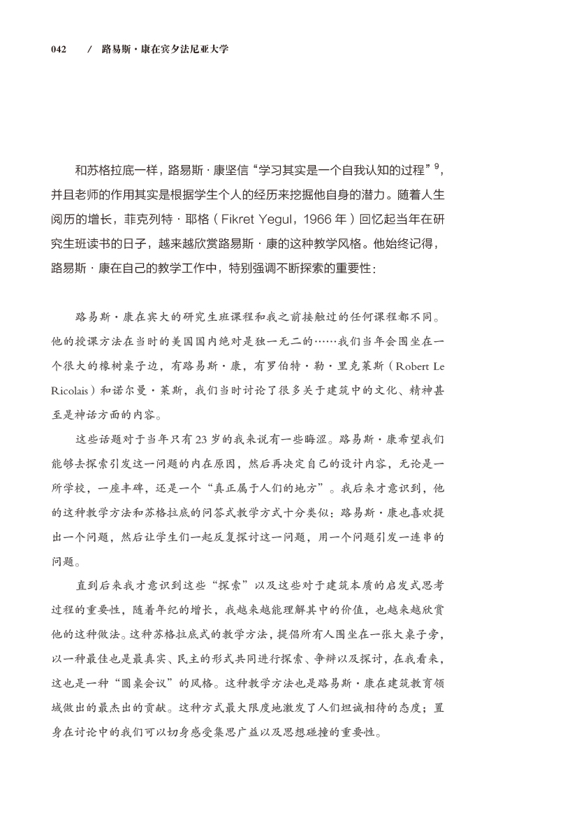 本書講述了路易斯·康的研究生教學(xué)工作所留給后人的,并不是他教授的內(nèi)容,并不是“如何做”,也不是他所提出的那些問題的答案。而是對(duì)問題本身的思考,對(duì)“做什么”的不斷追問和探索,對(duì)建筑本質(zhì)的上下求索。路易斯·康最杰出、最持久的貢獻(xiàn),便是激發(fā)了他的學(xué)生們的自信,去盡可能地相信自己的直覺與感覺,將對(duì)事物本質(zhì)的探索變成一生的追求。對(duì)于那些投身于建筑實(shí)踐工作中的學(xué)生們來說,路易斯·康真正做到了“給他們絕對(duì)的自由”,讓他們找到了自己的道路。而對(duì)于那些致力于教育事業(yè)的學(xué)生來說,他們會(huì)將路易斯·康的思想傳遞給自己的學(xué)生,而其中一部分人又會(huì)成為教師,所以路易斯·康的精神將一直傳承下去,影響一代又一代的年輕建筑師。