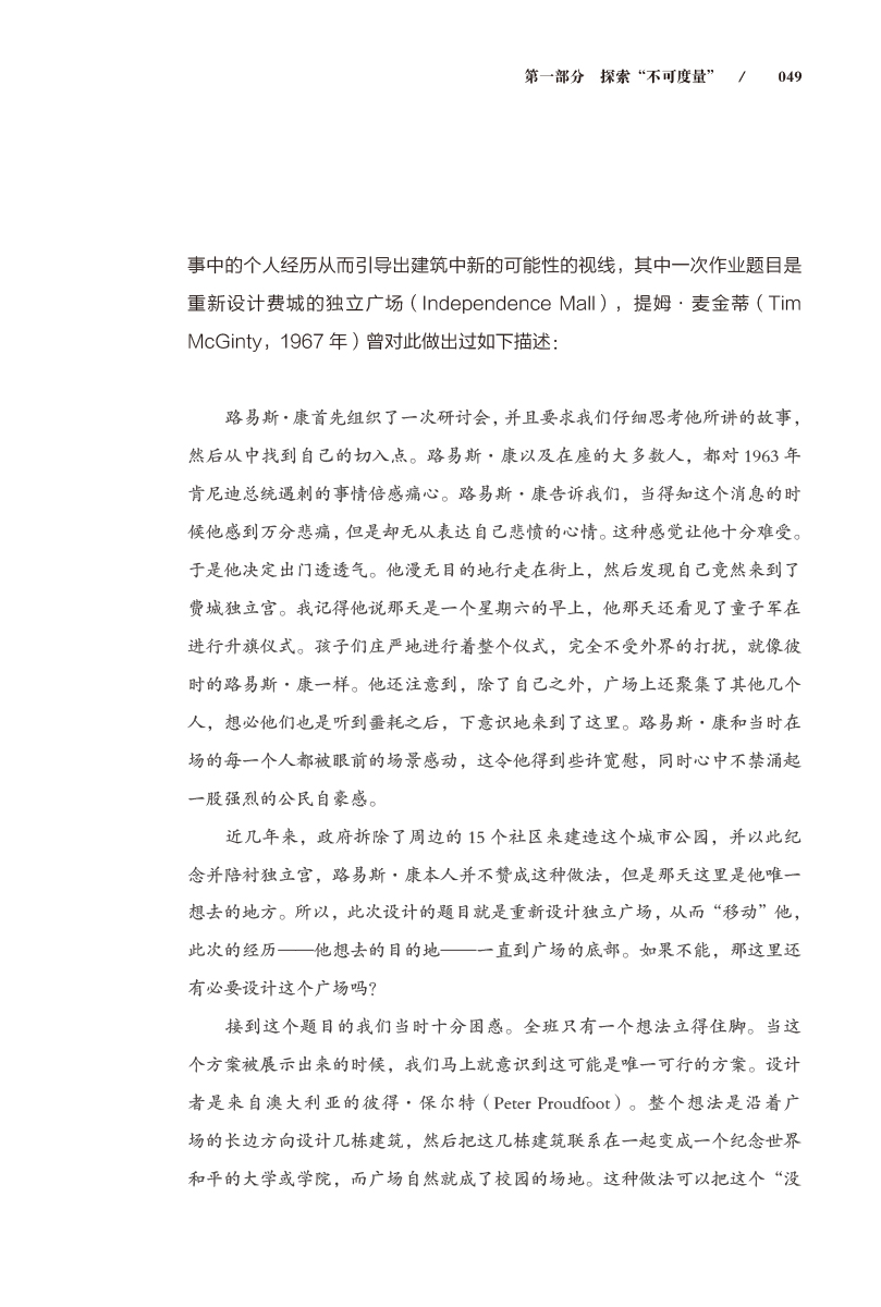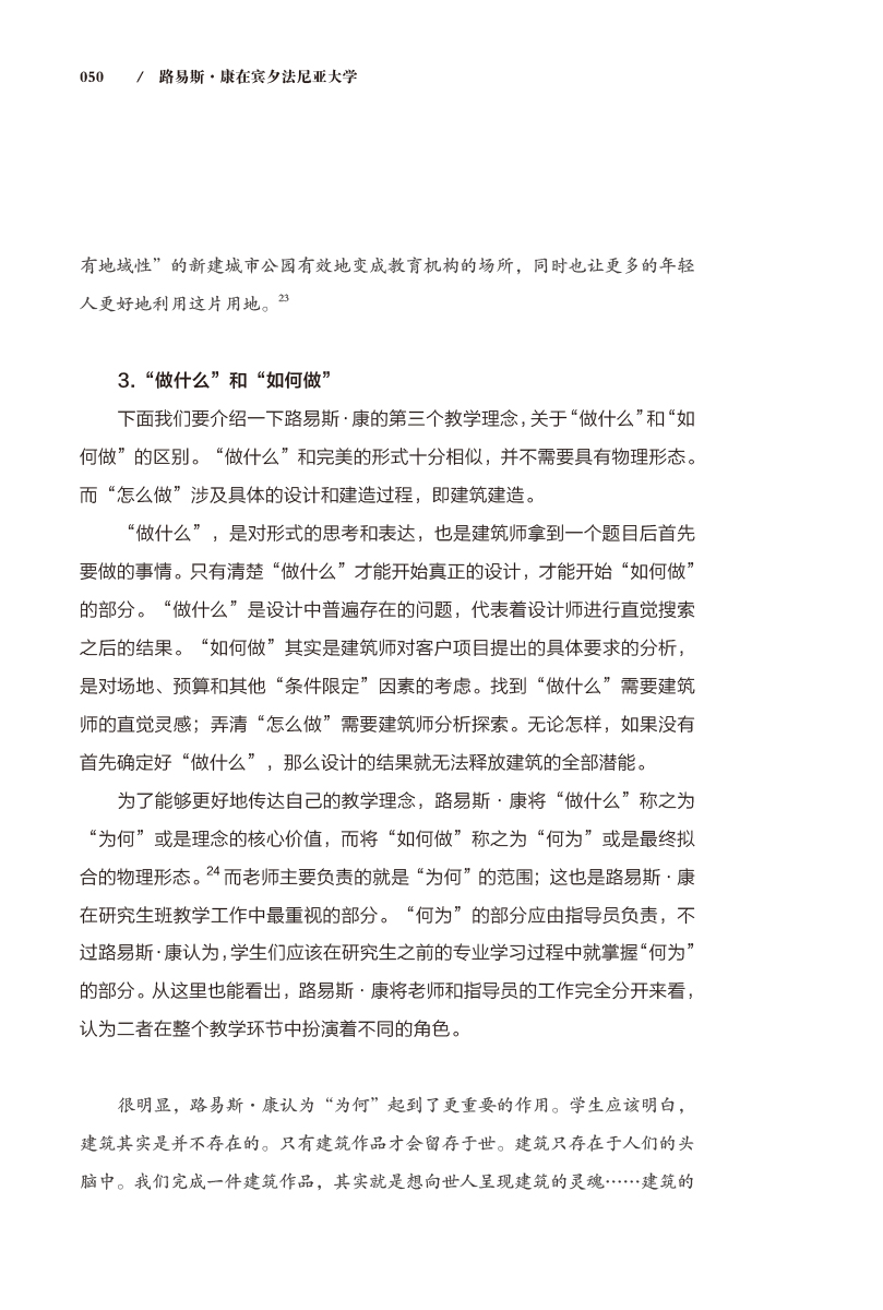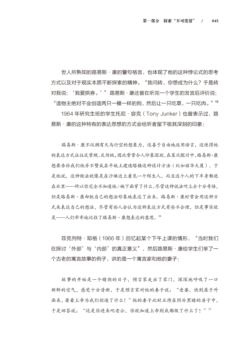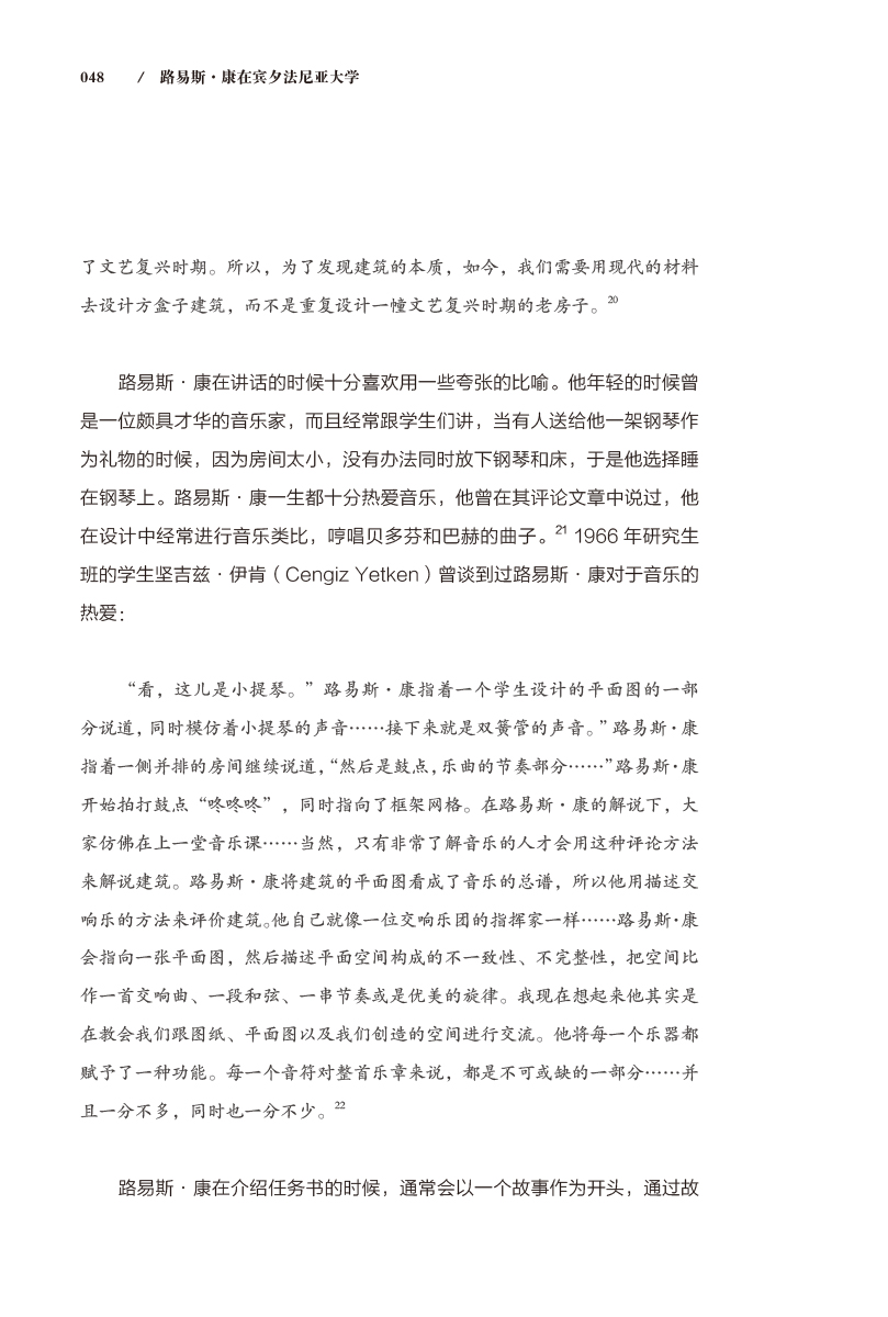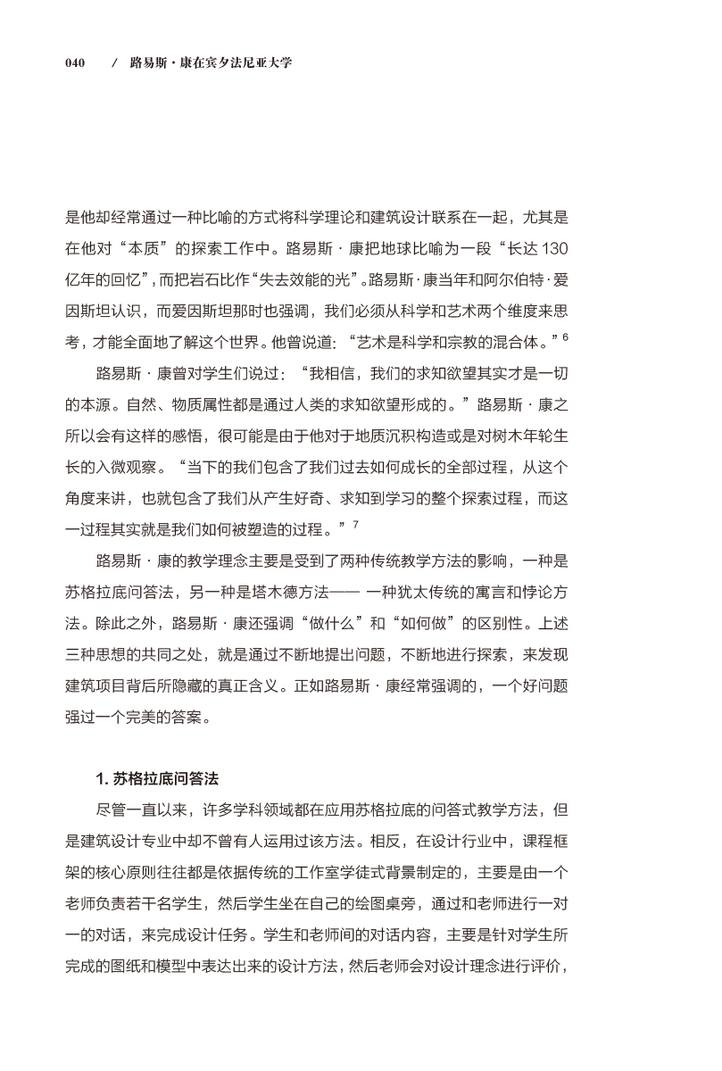 本書講述了路易斯·康的研究生教學(xué)工作所留給后人的,并不是他教授的內(nèi)容,并不是“如何做”,也不是他所提出的那些問題的答案。而是對(duì)問題本身的思考,對(duì)“做什么”的不斷追問和探索,對(duì)建筑本質(zhì)的上下求索。路易斯·康最杰出、最持久的貢獻(xiàn),便是激發(fā)了他的學(xué)生們的自信,去盡可能地相信自己的直覺與感覺,將對(duì)事物本質(zhì)的探索變成一生的追求。對(duì)于那些投身于建筑實(shí)踐工作中的學(xué)生們來說,路易斯·康真正做到了“給他們絕對(duì)的自由”,讓他們找到了自己的道路。而對(duì)于那些致力于教育事業(yè)的學(xué)生來說,他們會(huì)將路易斯·康的思想傳遞給自己的學(xué)生,而其中一部分人又會(huì)成為教師,所以路易斯·康的精神將一直傳承下去,影響一代又一代的年輕建筑師。