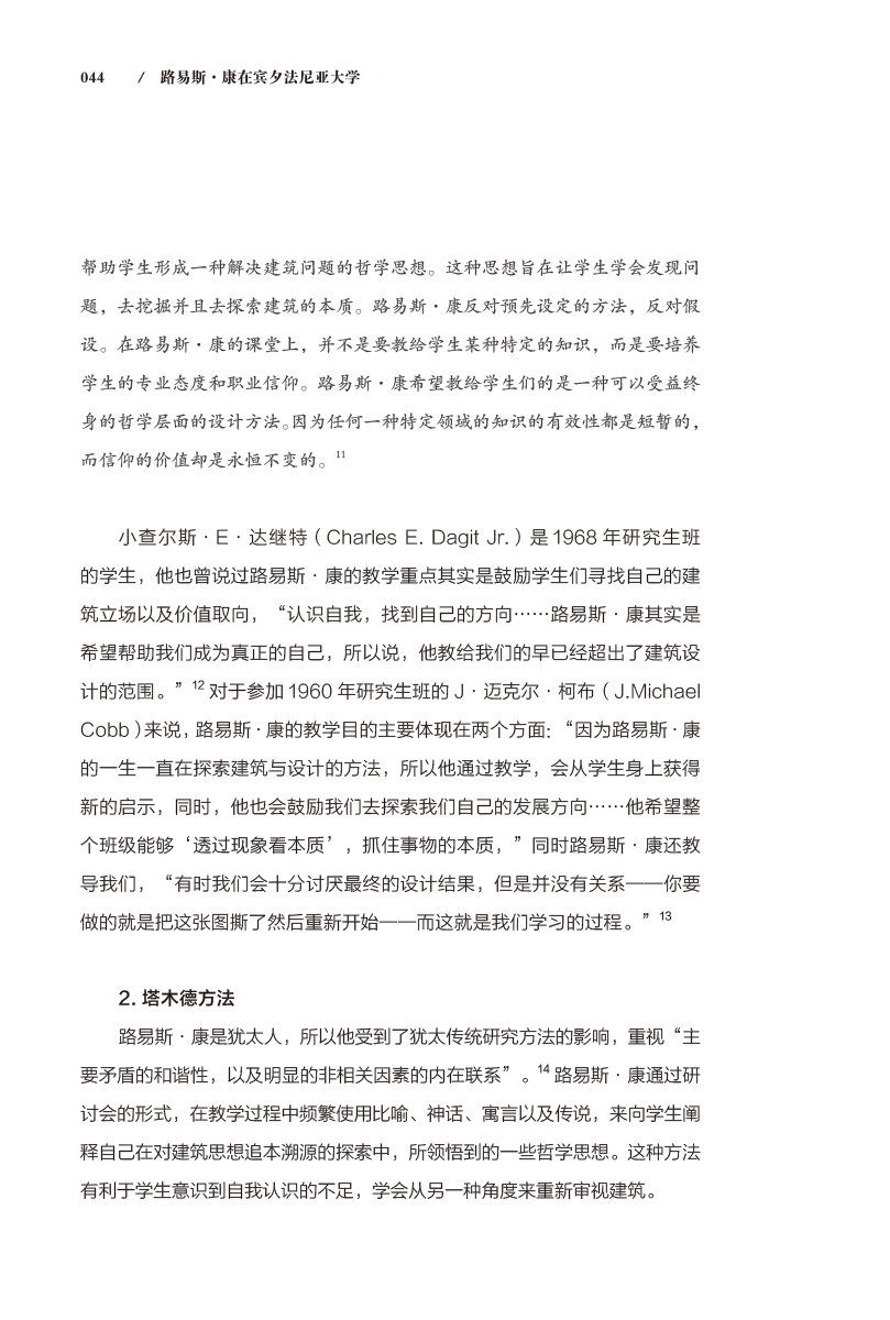 本書主要對(duì)路易斯·康在賓夕法尼亞大學(xué)執(zhí)教期間的教學(xué)理念和獨(dú)特的教學(xué)方法進(jìn)行了較透徹的研究和探討,也是首次由賓夕法尼亞大學(xué)研究生班的學(xué)生,以第一人稱的視角,來深入地分析和評(píng)價(jià)他的教學(xué)思想。