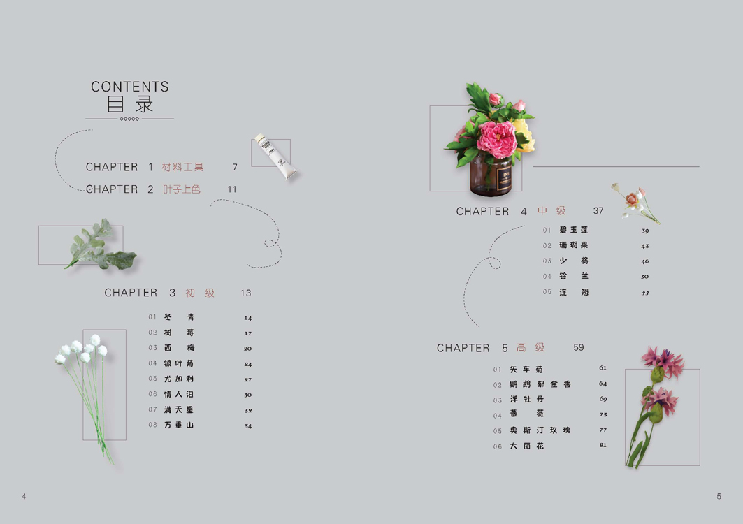 本書分為5部分內(nèi)容,第一部分黏土花材料工具詳細(xì)介紹;第二部分為黏土花葉子上色教程;第三部分為黏土花制作的初級教程,這部分內(nèi)容以圖文形式講述了8個初級教程的案例;第四部分為中級難度,這部分內(nèi)容以圖文形式講述了5個中級難度的案例;第五部分內(nèi)容為高級教程,這部分內(nèi)容以圖文形式講述了6個高級難度的案例。《黏土花——留下花開最美時》這本書讓我們在手把手教你制作黏土花,讓你作盡享玩玩黏土給你帶來的不一樣的生活體驗(yàn)。