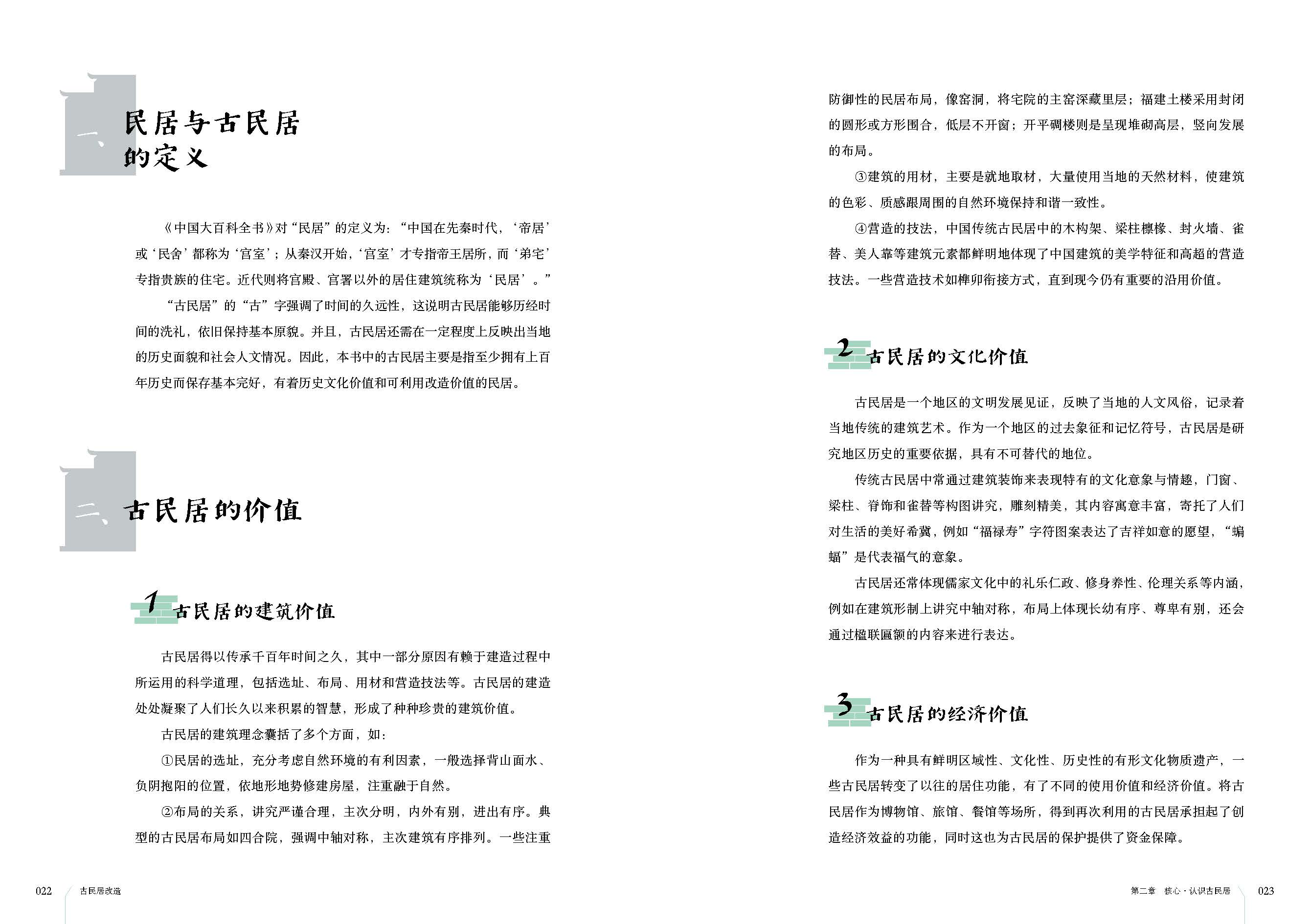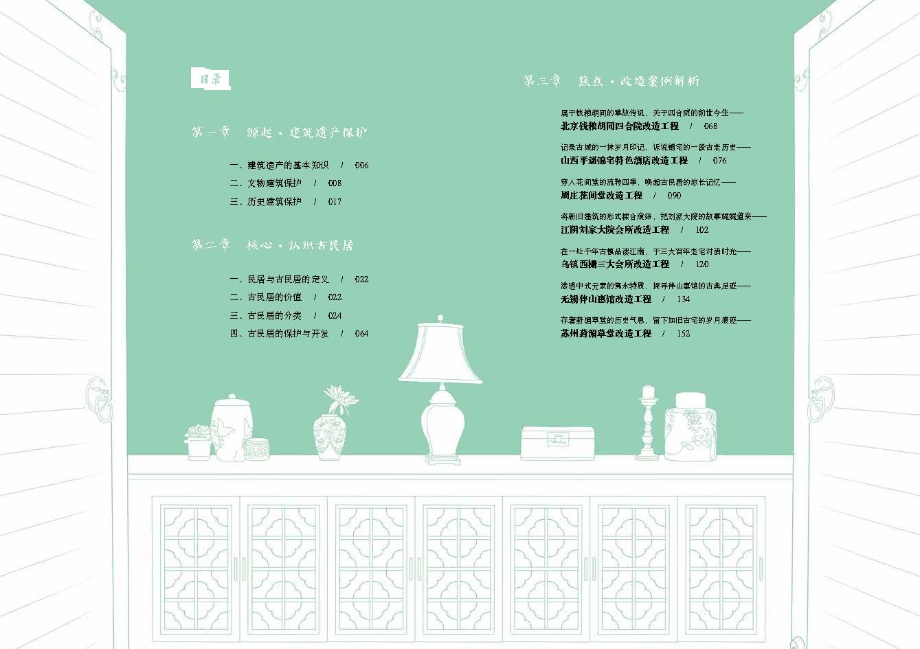 全書共三章,主要從兩大部分來(lái)闡釋古民居改造,一是關(guān)于古民居的基本知識(shí),包括古民居的相關(guān)概念、保護(hù)思想和改造原則等,還簡(jiǎn)要記錄了國(guó)內(nèi)不同地區(qū)的古民居之特征,讓讀者對(duì)古民居有大致系統(tǒng)性的認(rèn)識(shí);二是關(guān)于古民居改造實(shí)例的解析,選擇了七大古老民宅的改造故事,講述了它們的前世今生,致力于挖掘建筑本身的歷史淵源和舊記憶,并結(jié)合實(shí)際可行的圖紙,通過(guò)各種保護(hù)修復(fù)與改造的措施,把它們轉(zhuǎn)變成酒店、會(huì)所、民宿等有價(jià)值的再利用空間,將舊時(shí)光復(fù)刻在人們眼前。改造實(shí)例中還附有大量的精美實(shí)景圖,也有各種施工細(xì)部的詳細(xì)講解,能給予讀者帶來(lái)啟發(fā)性的思考。
