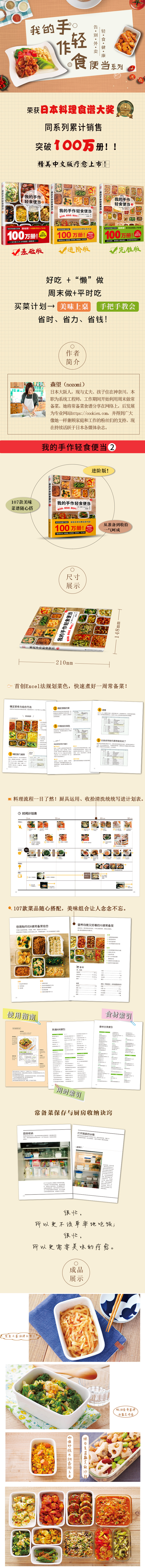 《我的手作輕食便當2》延續(xù)了第一本的寫作形式,而第二本中選擇的菜式更為實用。以及如何保存常備菜、怎樣完食不浪費食物,也是第二本書的特點!精美的外觀、營養(yǎng)的搭配、豐富的食材,每一款便當都讓人垂涎三尺,作者詳細介紹了怎樣在周末高效地煮完一整周料理,分配菜色、廚具運用、時間安排、收拾清洗使用圖像呈現(xiàn),詳細說明調(diào)理時間、保存期限,以及食材成本,簡單的制作步驟任誰都可以輕松學會。手把手教你做107種菜品,主菜、配菜、米飯完美搭配,美味又健康,天天不重樣。