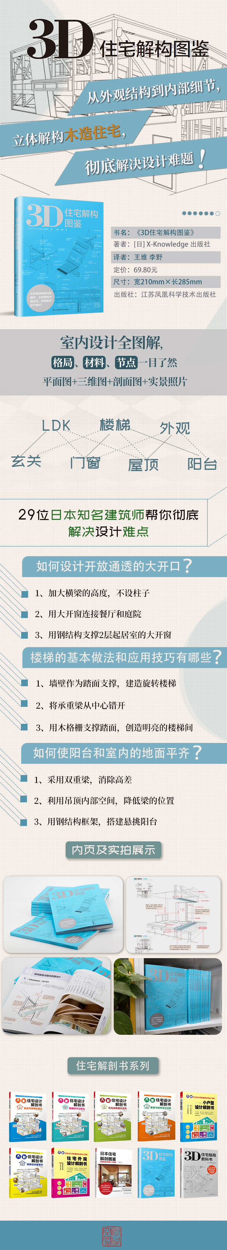 本書分別從住宅的開口部、樓梯、浴室、玄關(guān)、陽臺、屋頂、建筑外形七個部分拆解住宅設(shè)計的要點。除平、立、剖面圖之外,書內(nèi)收錄大量3D效果圖,室內(nèi)配置、建筑材料、節(jié)點等一目了然,旨在向設(shè)計師全方位呈現(xiàn)住宅設(shè)計細(xì)部,非常具有可參考價值。