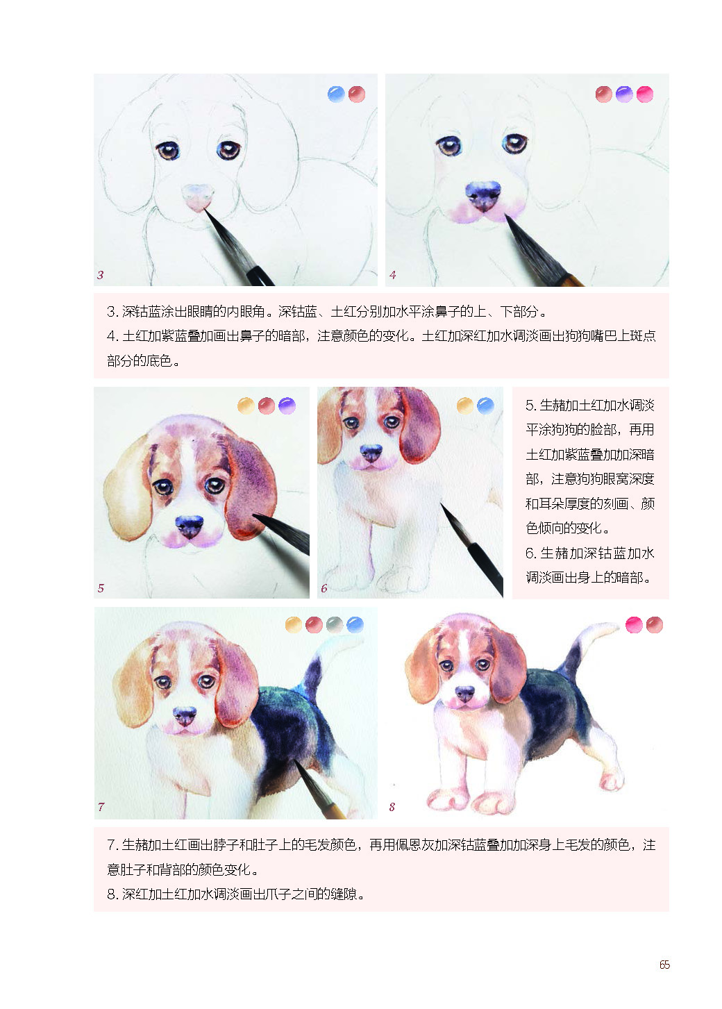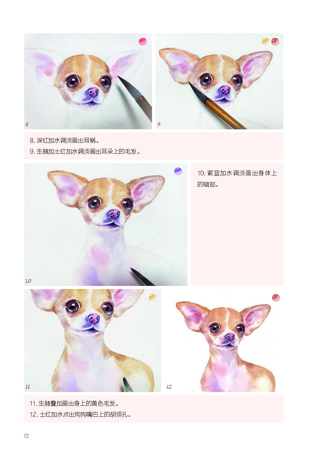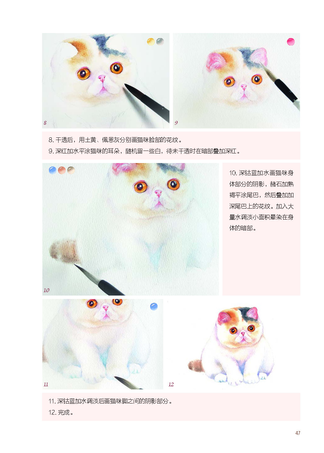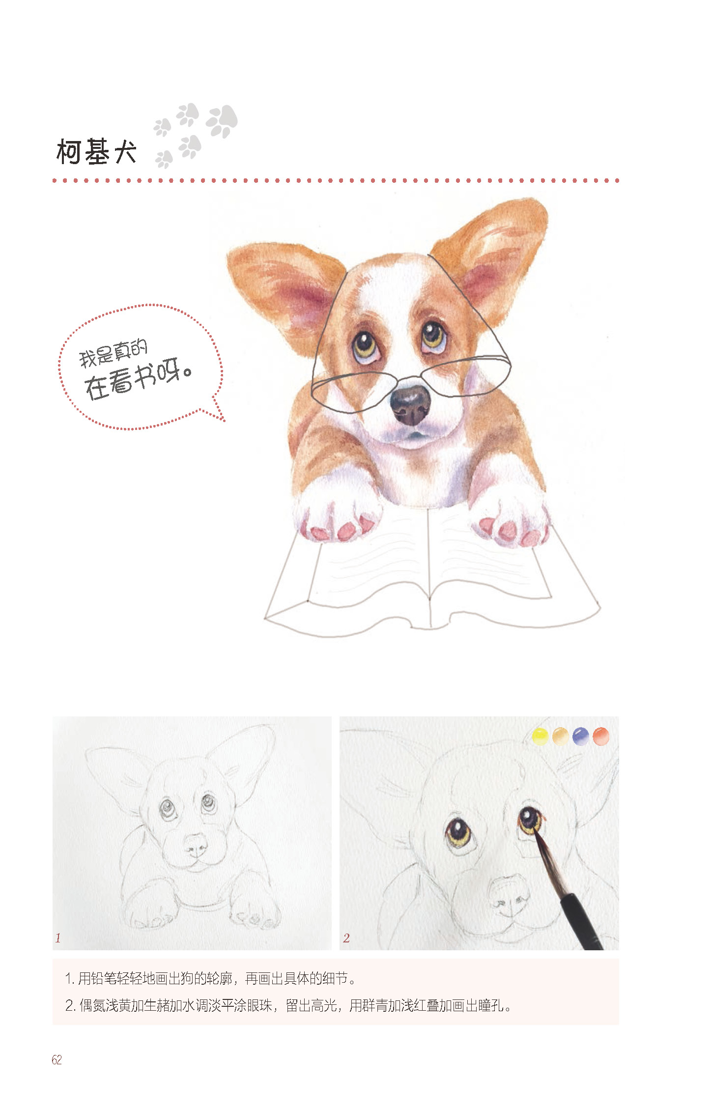 1.以萌寵作為切入點,展現(xiàn)了水彩畫中對萌寵的顏色、布局、質(zhì)感以及工具和基本技法的學(xué)習(xí),圖解直觀,簡單易懂。