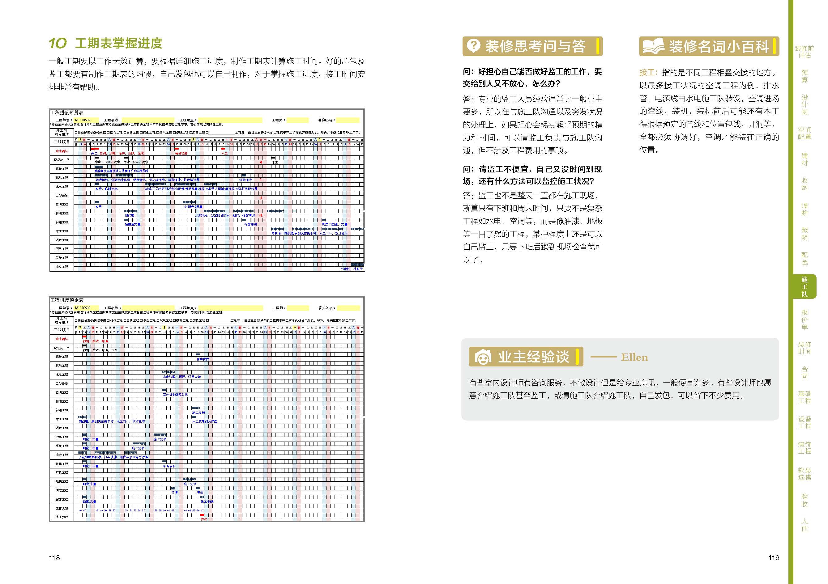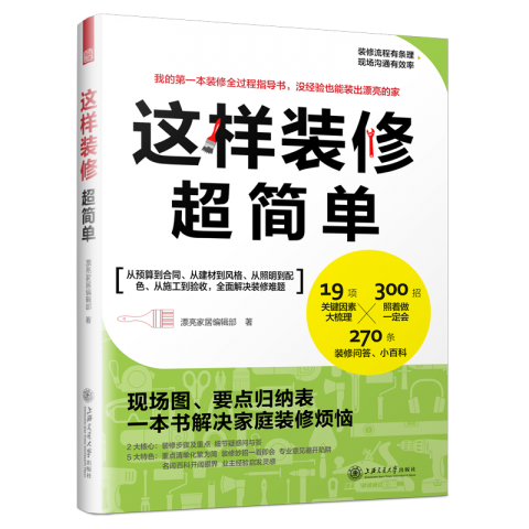 書中歸納出裝修前評估、裝修預(yù)算、設(shè)計(jì)圖構(gòu)思、空間配置、建材運(yùn)用、柜體收納、室內(nèi)隔斷、空間照明、空間配色、工程法規(guī)、尋找施工隊(duì)、了解行情、裝修時(shí)間、檢查合同、基礎(chǔ)工程、設(shè)備工程、裝飾工程、軟裝選搭、完工驗(yàn)收、搬家入住等 20 項(xiàng)裝修關(guān)鍵內(nèi)容。
