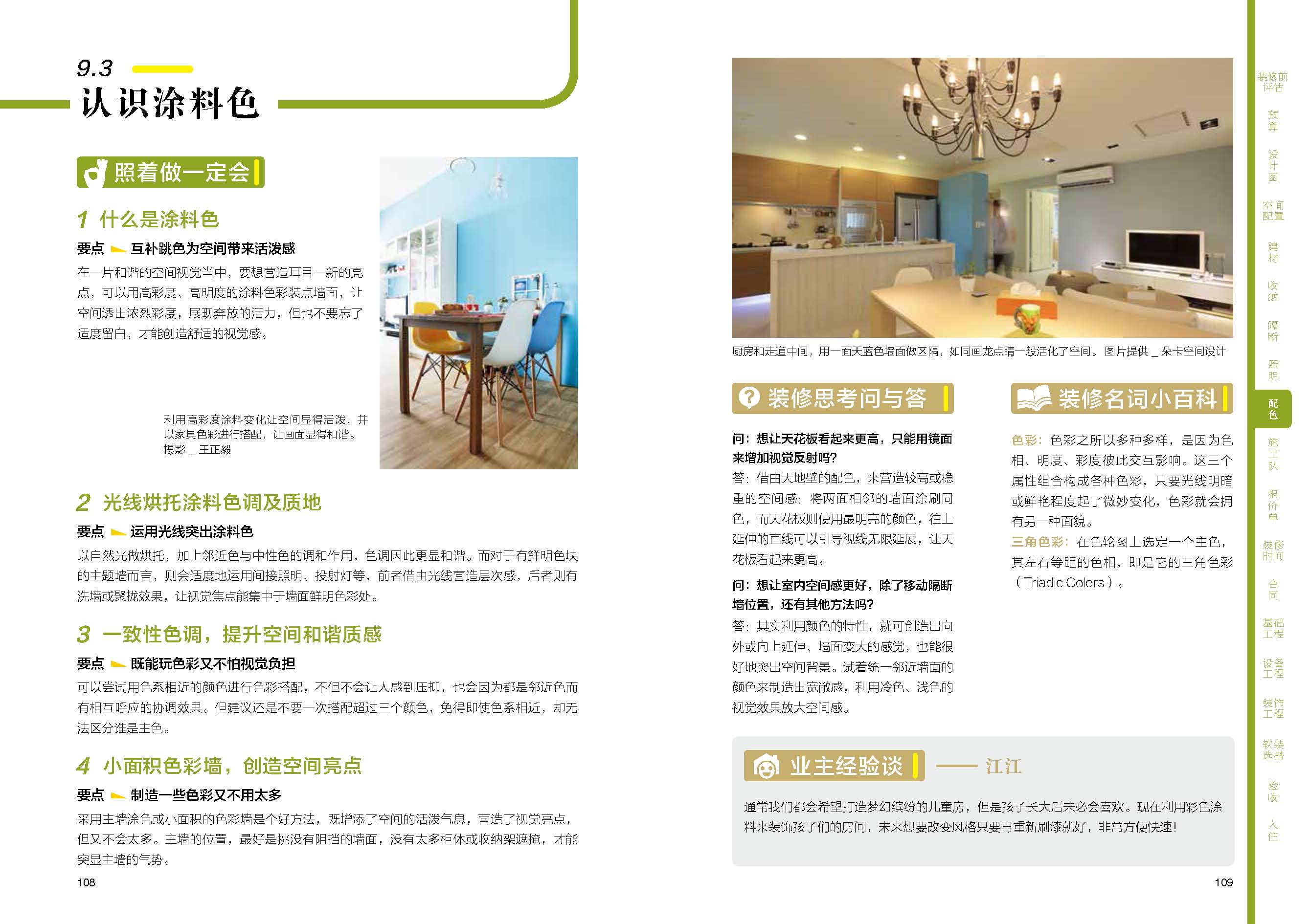 書中設(shè)計(jì)了裝修答問、裝修百科、業(yè)主經(jīng)驗(yàn)談、設(shè)計(jì)師建議等小專欄,讓讀者不但理解裝修全流程,對裝修過程中涉及的專業(yè)名詞、困惑等都有了了解,跟施工隊(duì)溝通起來無障礙;通過有經(jīng)驗(yàn)的業(yè)主講述裝修經(jīng)驗(yàn)給第一次裝修的業(yè)主提供了很好的參考。