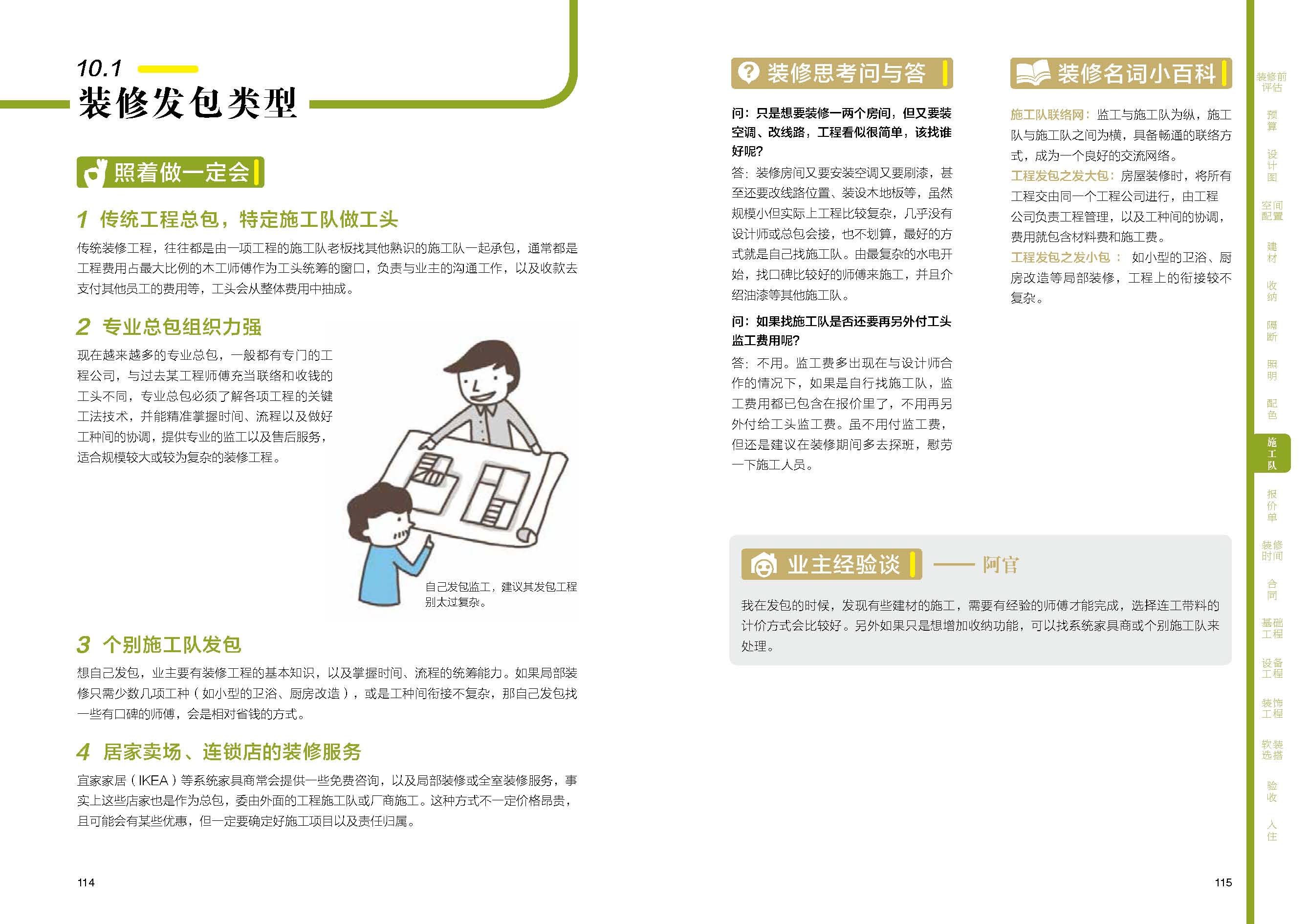 1.裝修項(xiàng)目:本書共包含 20 個(gè)項(xiàng)目,將發(fā)包、施工全過程中業(yè)主最迫切需要了解的內(nèi)容分章呈現(xiàn)。