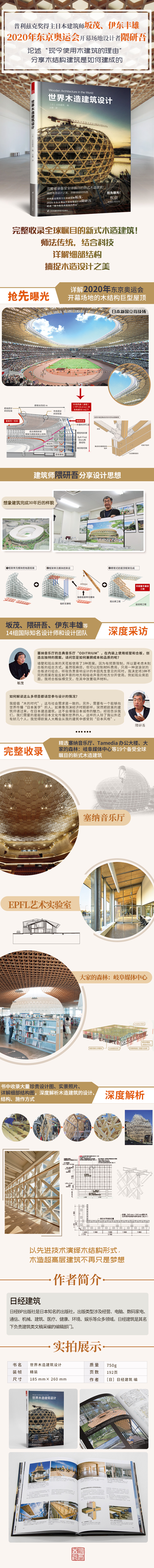 本書是日本日經(jīng)BP出版社編寫的“日經(jīng)建筑精選”系列叢書中的第一本。本書以“世界木造建筑設(shè)計(jì)”為主題,分為“領(lǐng)跑世界木結(jié)構(gòu)建筑的日本建筑師們”“領(lǐng)先于日本的高層木結(jié)構(gòu)建筑”“令人期待的新建材——竹子”“開創(chuàng)高耐火性、高抗震性的日本都市木結(jié)構(gòu)建筑10 選”四個(gè)部分,采訪了14組世界知名設(shè)計(jì)師和設(shè)計(jì)團(tuán)隊(duì),精選了建筑大師和知名建筑事務(wù)所的19個(gè)經(jīng)典案例,以先進(jìn)技術(shù)演繹木結(jié)構(gòu)形式,深度解析木造建筑的設(shè)計(jì)、結(jié)構(gòu)、施作方式,并分享了實(shí)際施工時(shí)能提高經(jīng)濟(jì)、社會(huì)效益的方法,為讀者提供真正能落實(shí)在設(shè)計(jì)中的知識(shí)。
