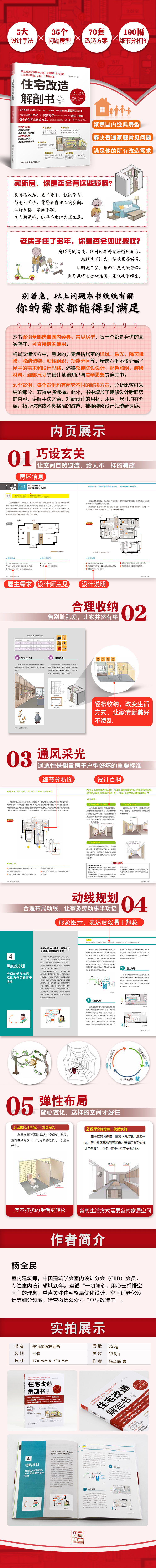 書中通過巧設(shè)玄關(guān)、合理收納、通風(fēng)采光、動(dòng)線規(guī)劃、彈性布局5大設(shè)計(jì)手法,作者親身設(shè)計(jì)與參與改造的35個(gè)實(shí)例,解決了國內(nèi)大部分房型表現(xiàn)出的問題,得到了業(yè)主的真心贊許。