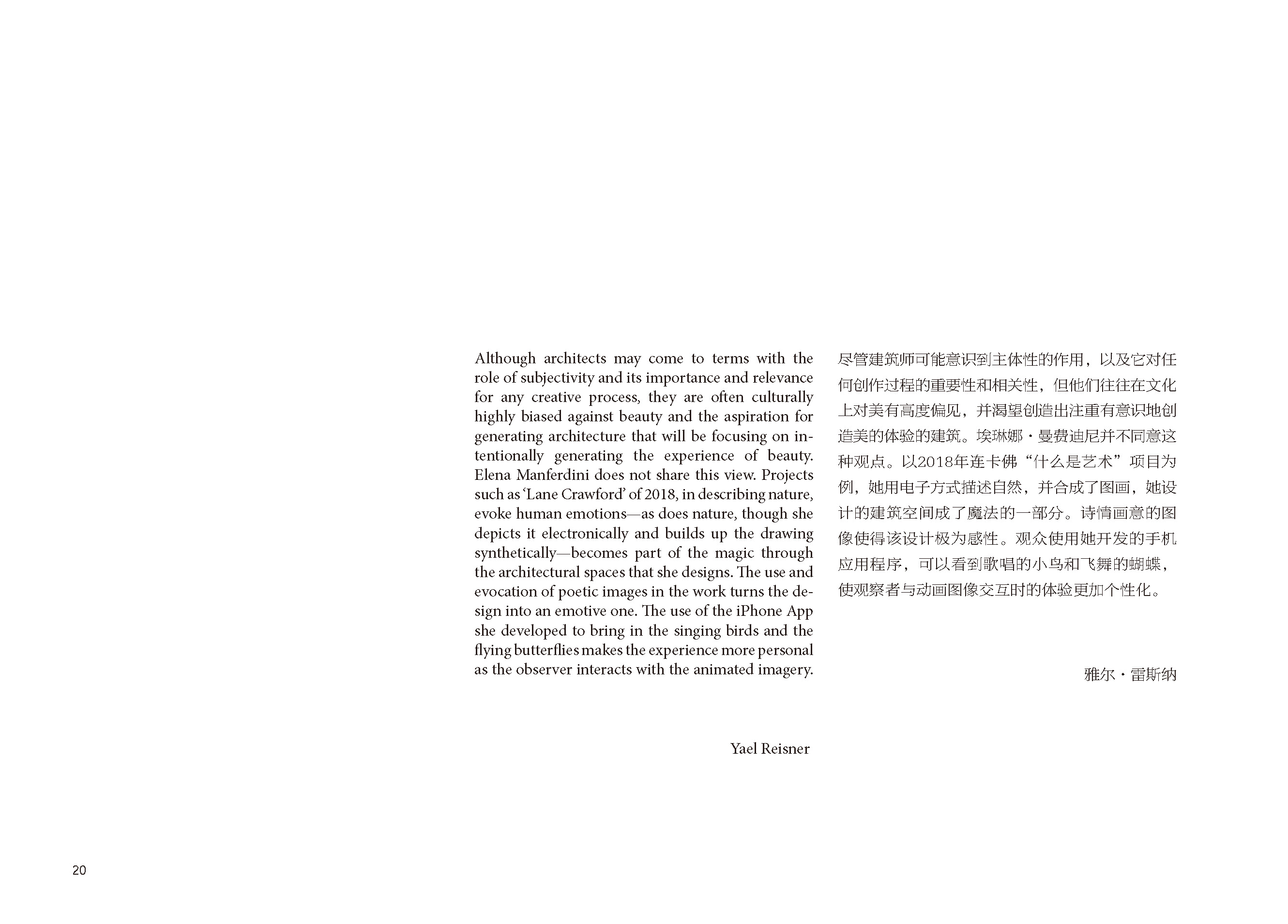 本書收集了埃琳娜近6年的參數(shù)化設(shè)計(jì)成果,分為“水平”與“豎直”兩冊(cè)出版,前者是“圖片”,后者是“圖紙”,兩者都基于數(shù)字技術(shù)產(chǎn)生。前者是“通過3D掃描采集的自然元素,如植物群和動(dòng)物群,初始狀態(tài)是三維數(shù)字點(diǎn)云,將它們進(jìn)行處理形成這些圖片”,呈現(xiàn)出嶄新的充滿觸感的合成環(huán)境;后者是“通過編寫代碼生成的圖形,沒有一張像通常建筑圖一樣是從三維到二維平面的減法過程獲得的結(jié)果,它們就像按比例縮小的建筑物再現(xiàn)”。這是埃琳娜對(duì)數(shù)字技術(shù)與建筑設(shè)計(jì)相結(jié)合這一問題進(jìn)行獨(dú)特而深度思考的結(jié)果,它讓我們重新審視在數(shù)字技術(shù)條件下建筑設(shè)計(jì)的“表現(xiàn)”方法與理論。我想無論西方學(xué)者還是中國學(xué)者都一定會(huì)對(duì)這本書產(chǎn)生強(qiáng)烈的反響。